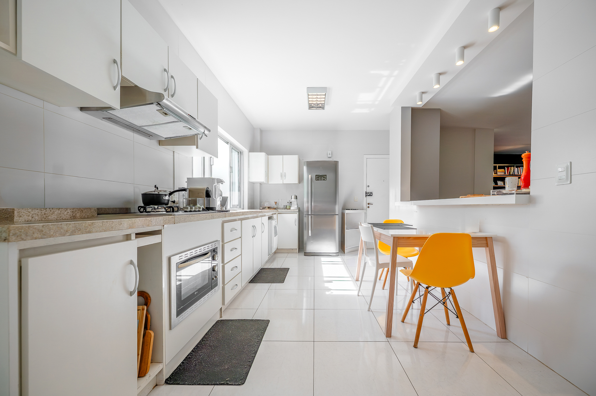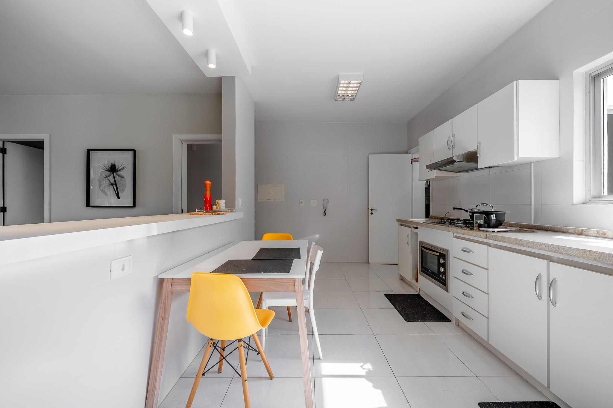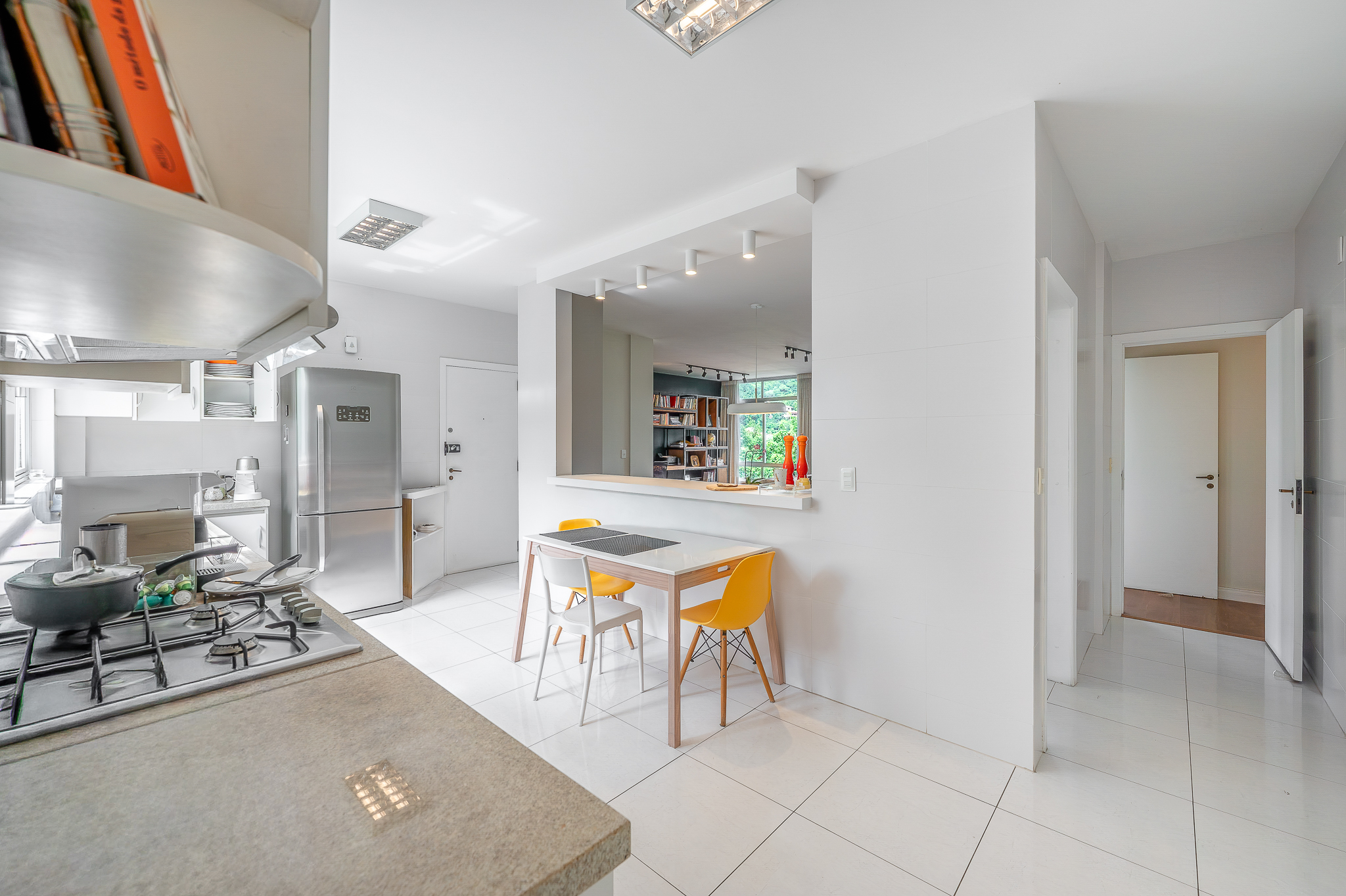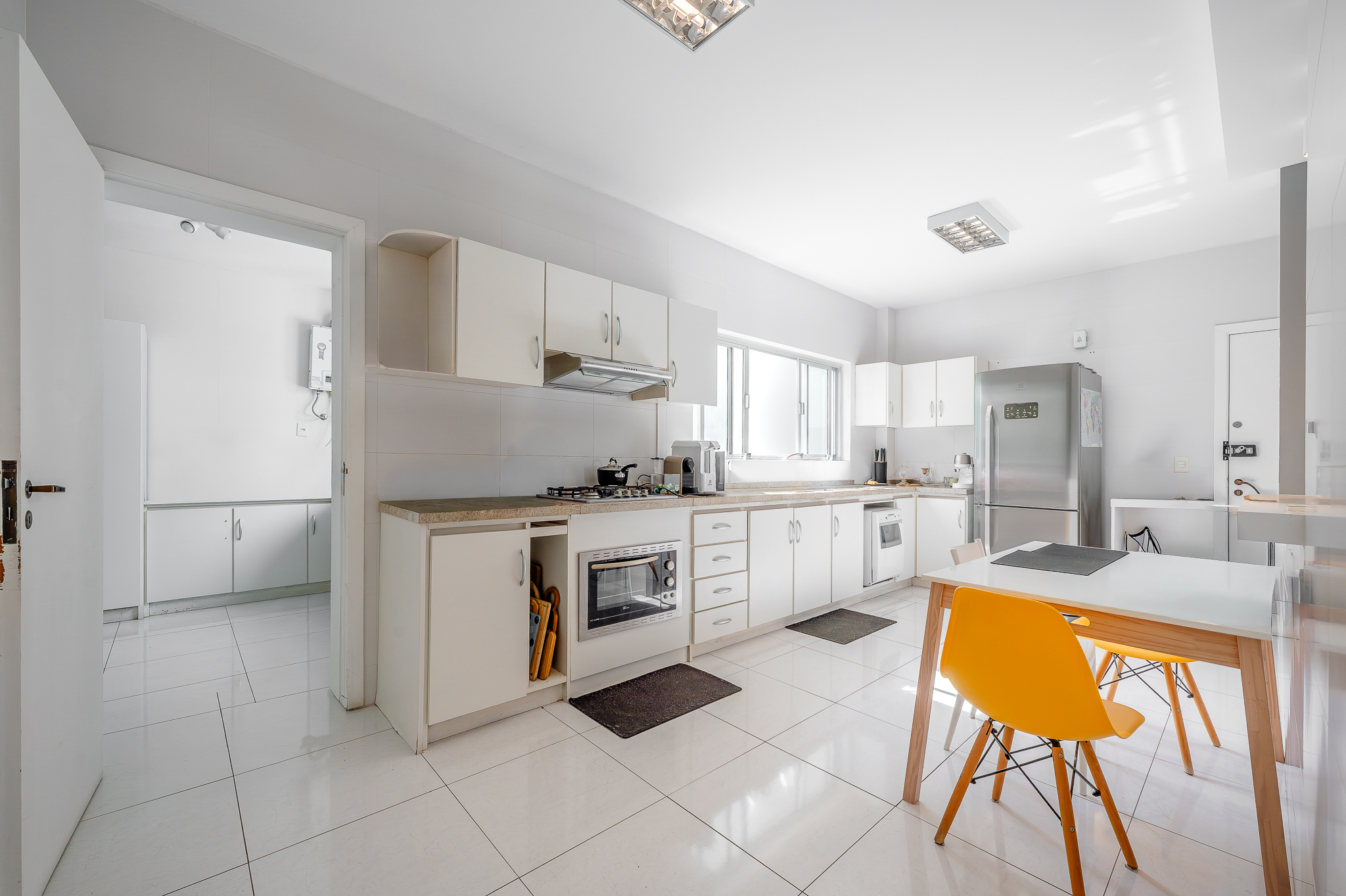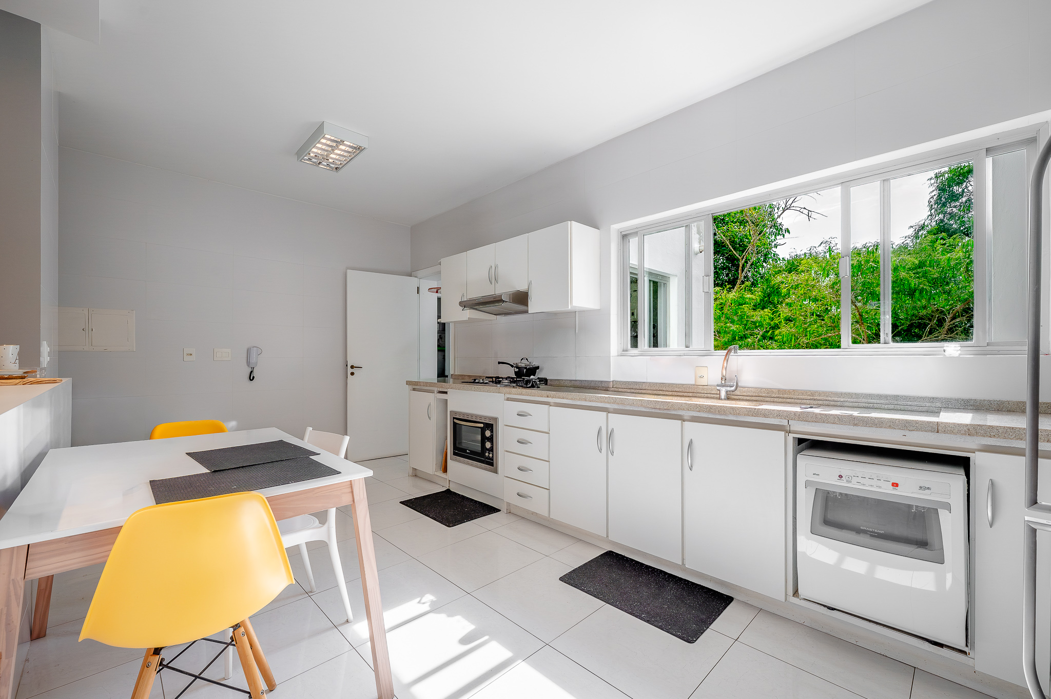 A cozinha entra no mesmo ritmo, integrada por bancada, aberta na medida certa e com um ar contemporâneo. Ampla, com móveis planejados e um janelão que repete a vista verde como pano de fundo. Uma porta garante a separação da área de serviço, que acompanha a proposta: espaçosa, ventilada e com quarto de apoio e banheiro.