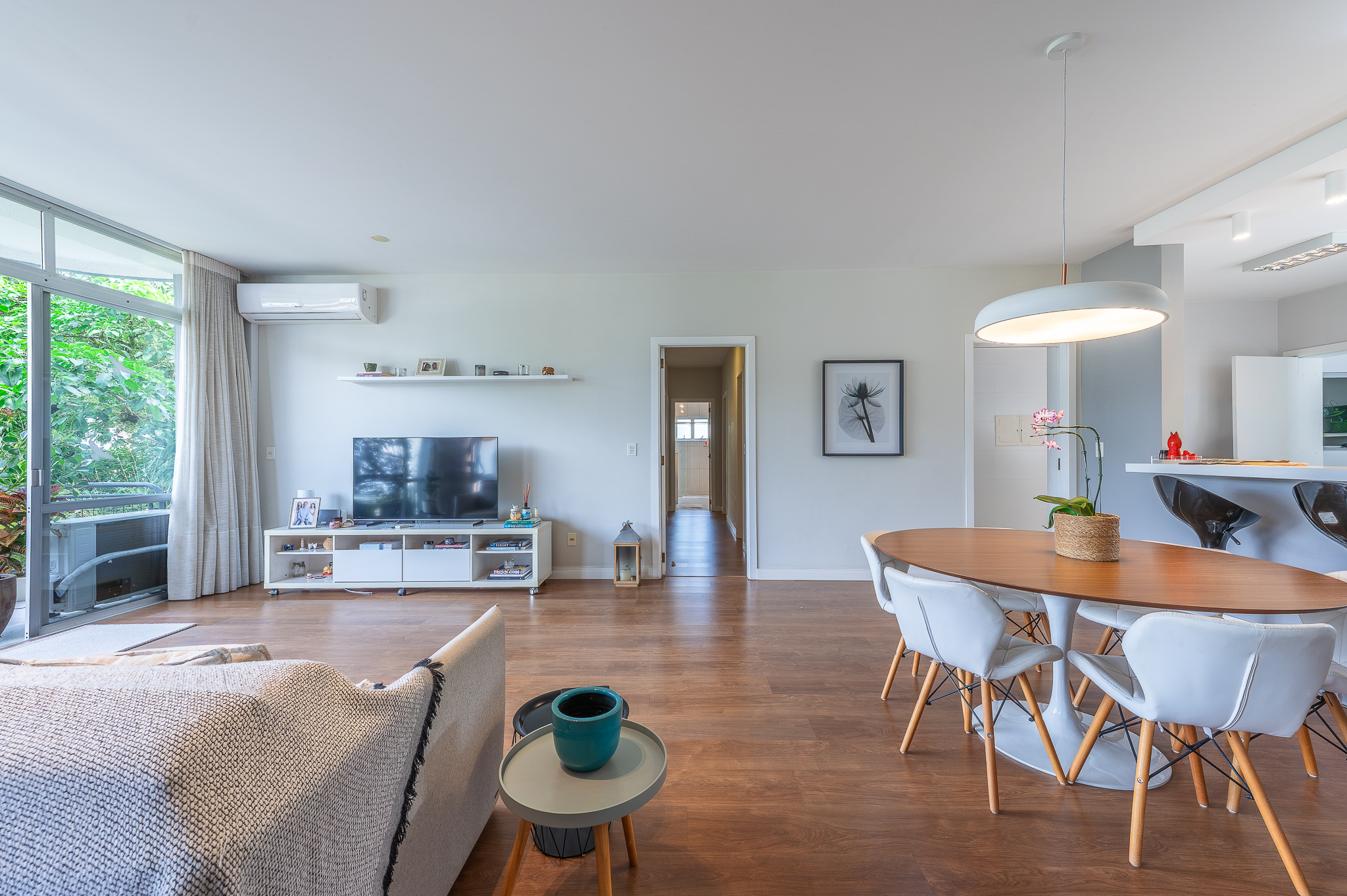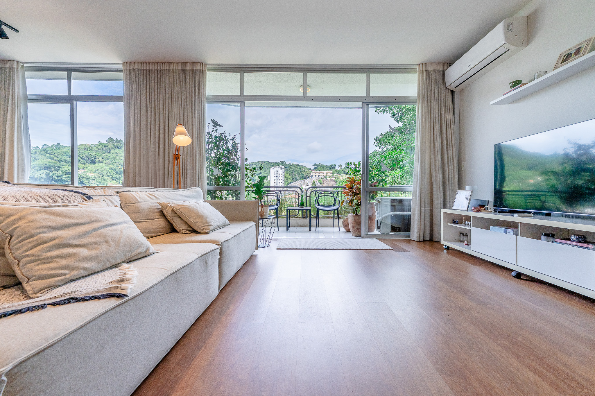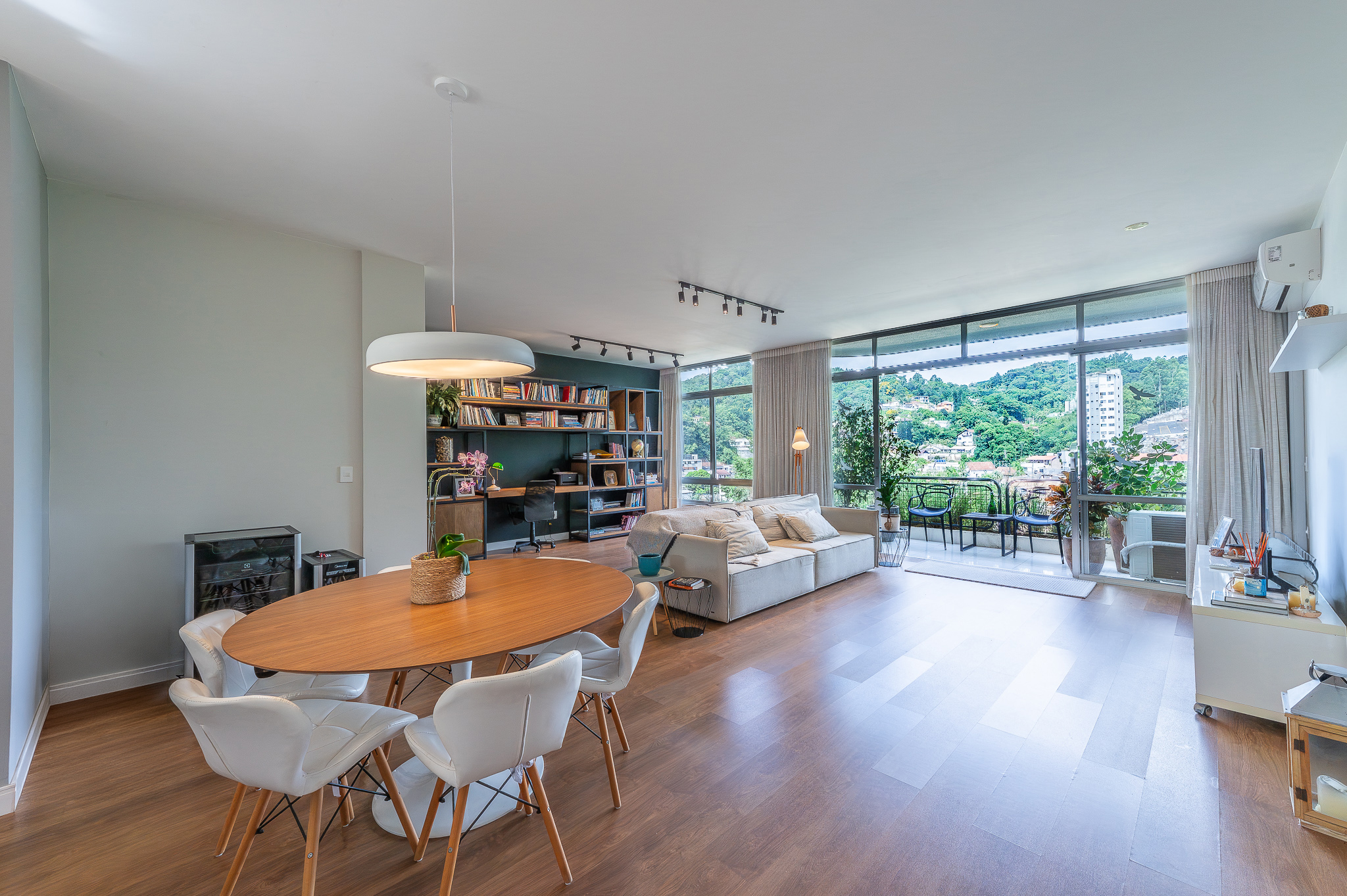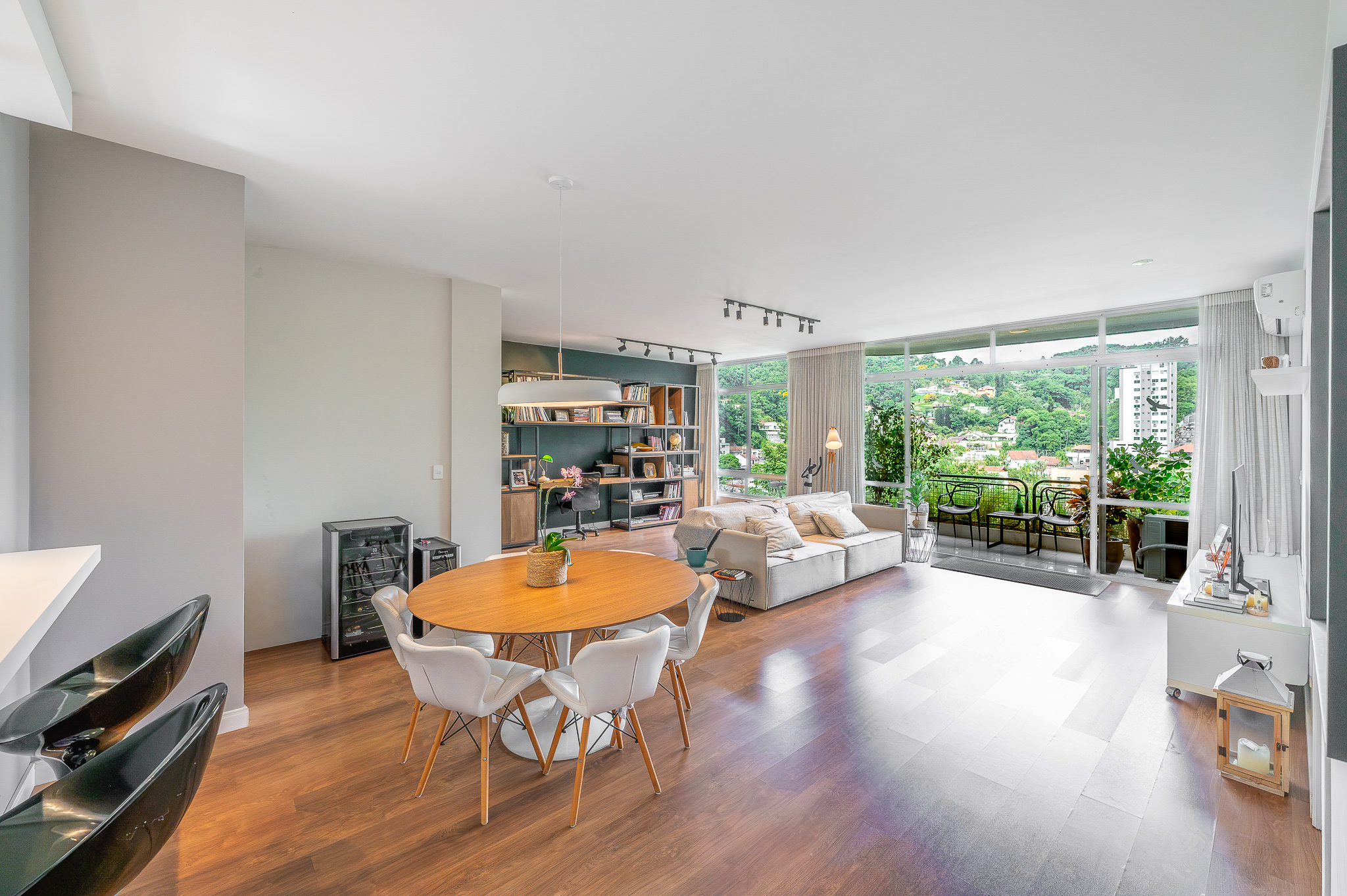 A porta abre e o impacto é imediato: janelões piso-teto trazem o verde para dentro e transformam a imensa sala de estar e jantar em uma verdadeira casa suspensa. A varanda generosa prolonga esse cenário com árvores centenárias, um toque urbano ao fundo e mais verde no horizonte. Luz natural e ventilação atravessam o apê o dia inteiro, criando uma atmosfera leve, viva e silenciosa.