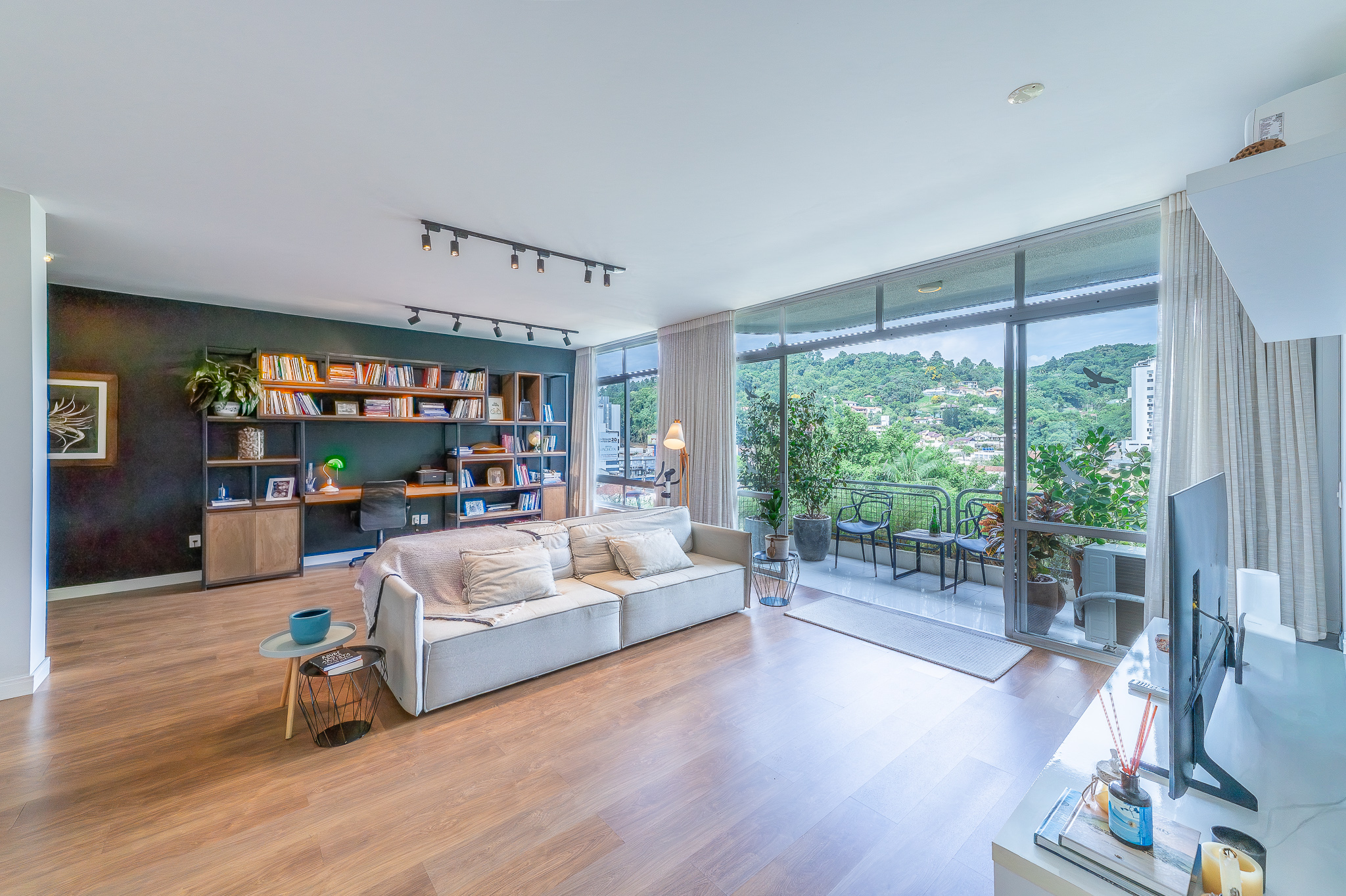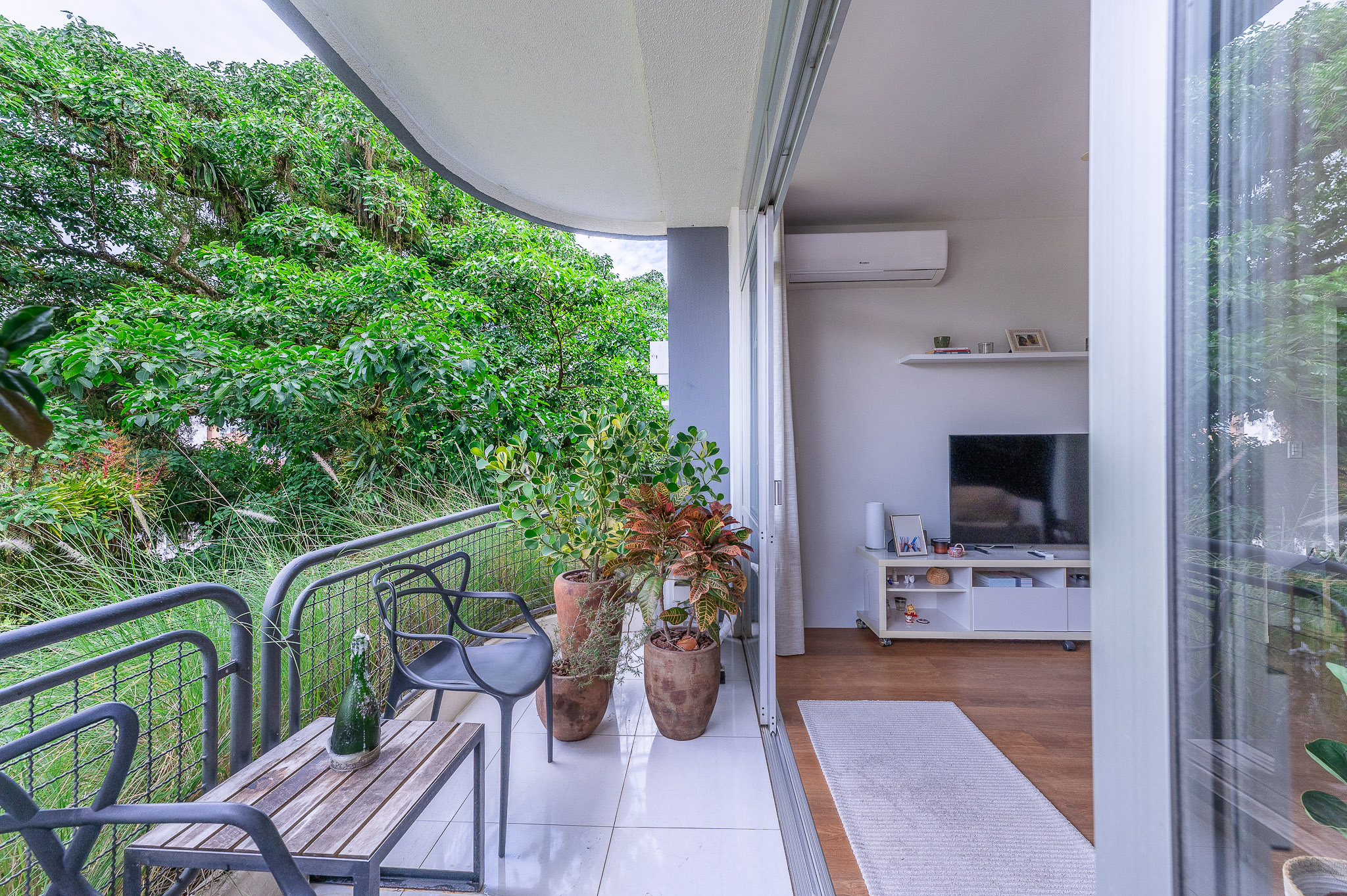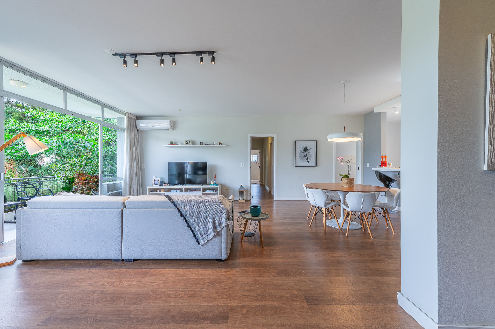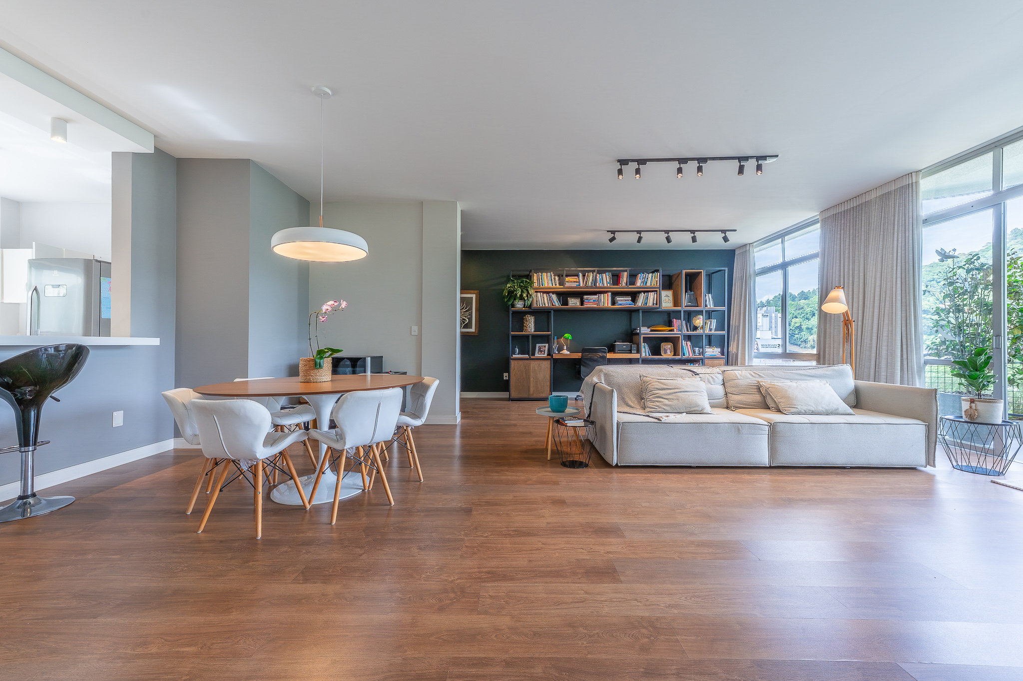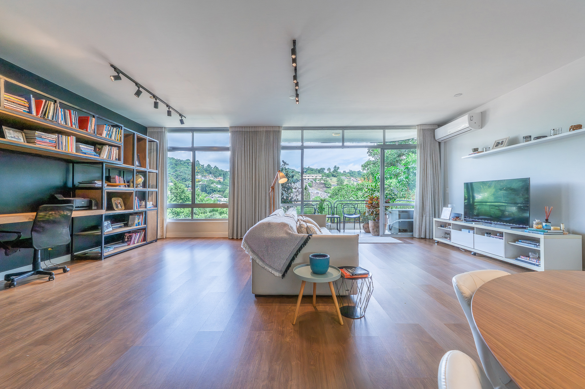 A porta abre e o impacto é imediato: janelões piso-teto trazem o verde para dentro e transformam a imensa sala de estar e jantar em uma verdadeira casa suspensa. A varanda generosa prolonga esse cenário com árvores centenárias, um toque urbano ao fundo e mais verde no horizonte. Luz natural e ventilação atravessam o apê o dia inteiro, criando uma atmosfera leve, viva e silenciosa.