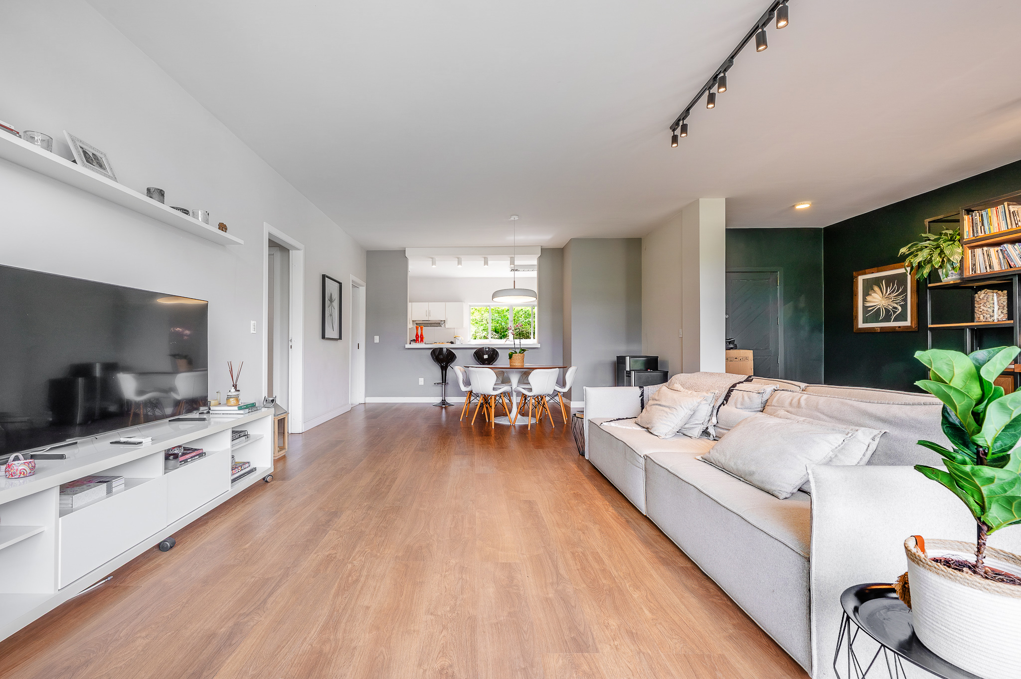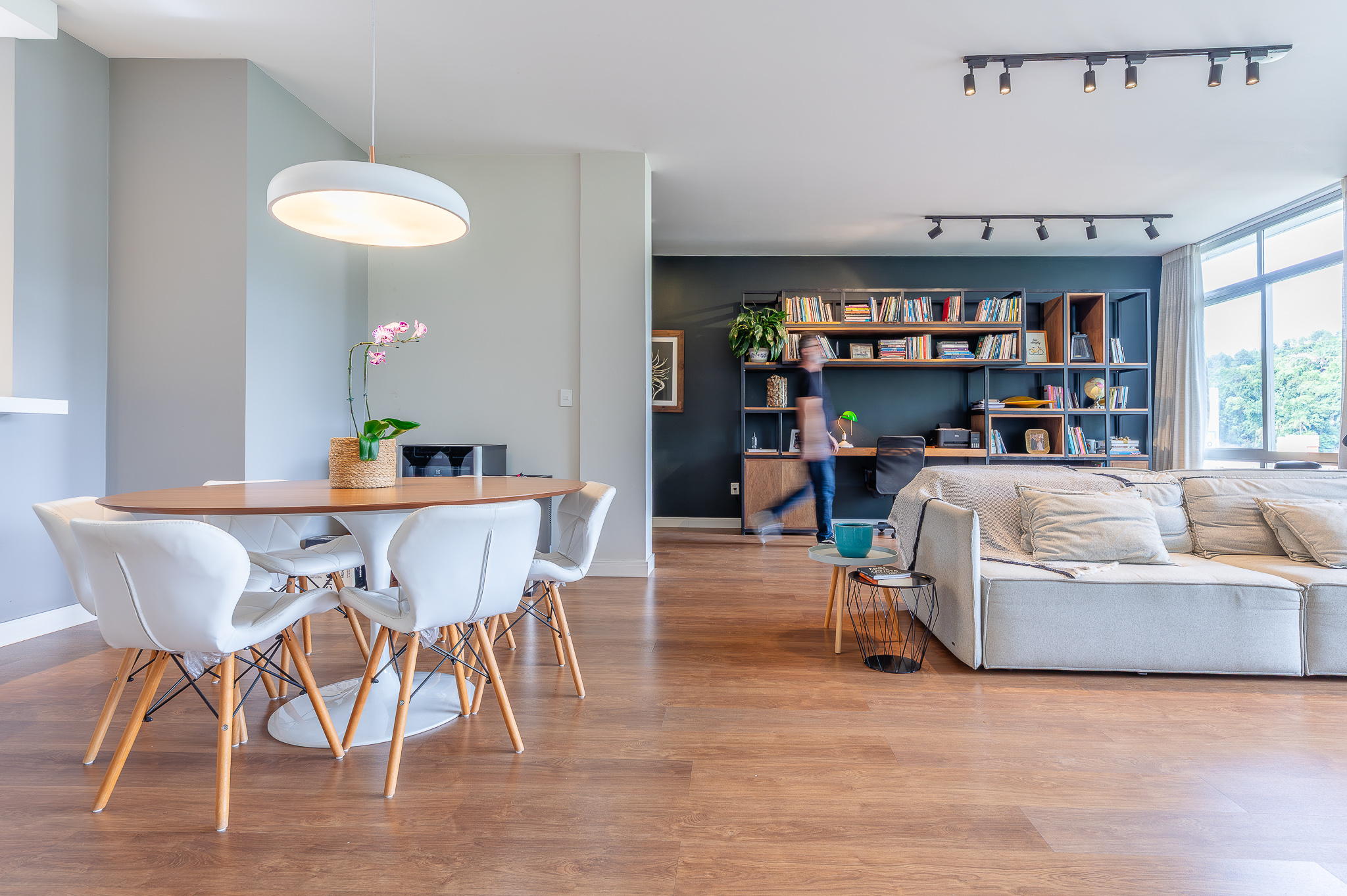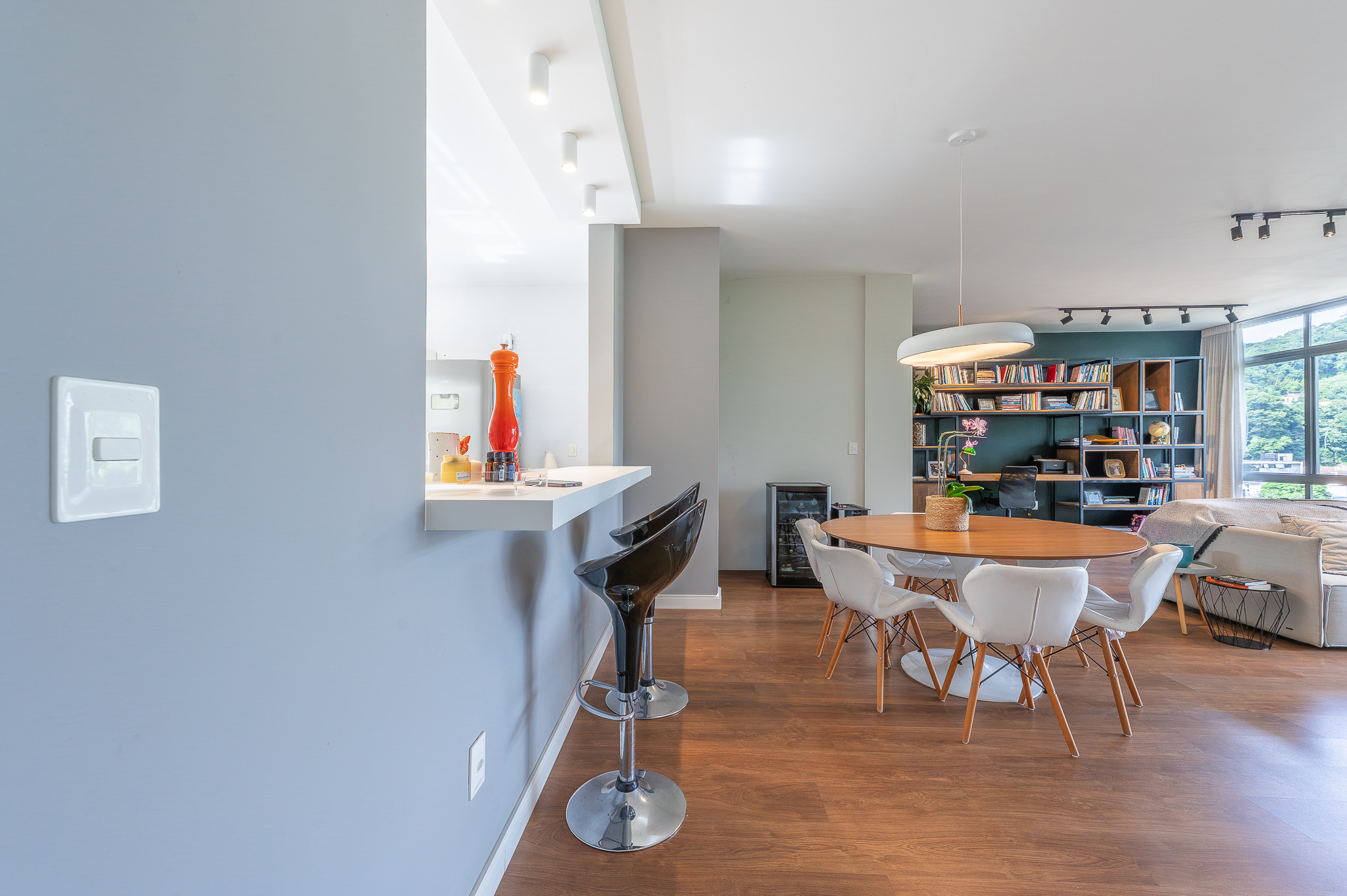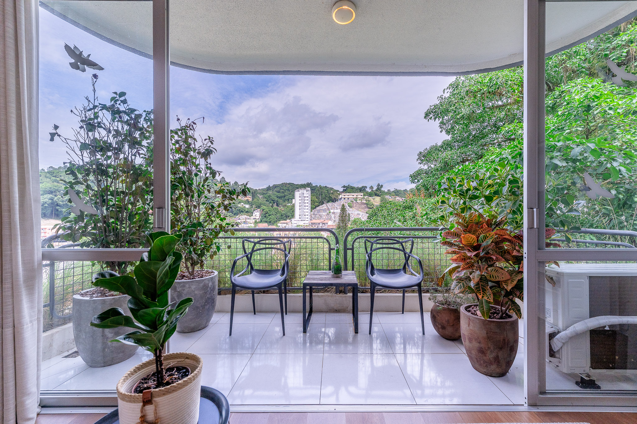 A porta abre e o impacto é imediato: janelões piso-teto trazem o verde para dentro e transformam a imensa sala de estar e jantar em uma verdadeira casa suspensa. A varanda generosa prolonga esse cenário com árvores centenárias, um toque urbano ao fundo e mais verde no horizonte. Luz natural e ventilação atravessam o apê o dia inteiro, criando uma atmosfera leve, viva e silenciosa.
