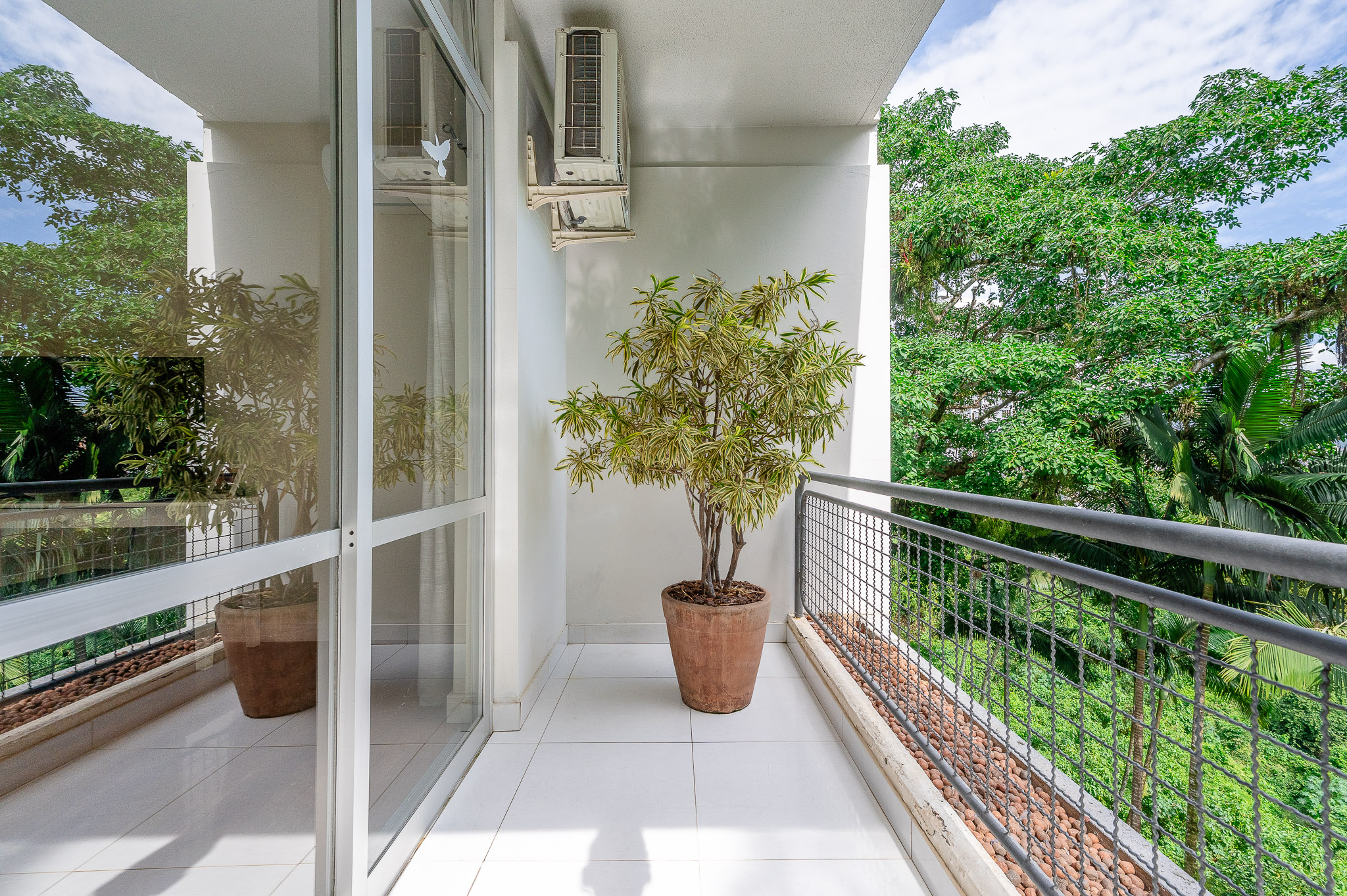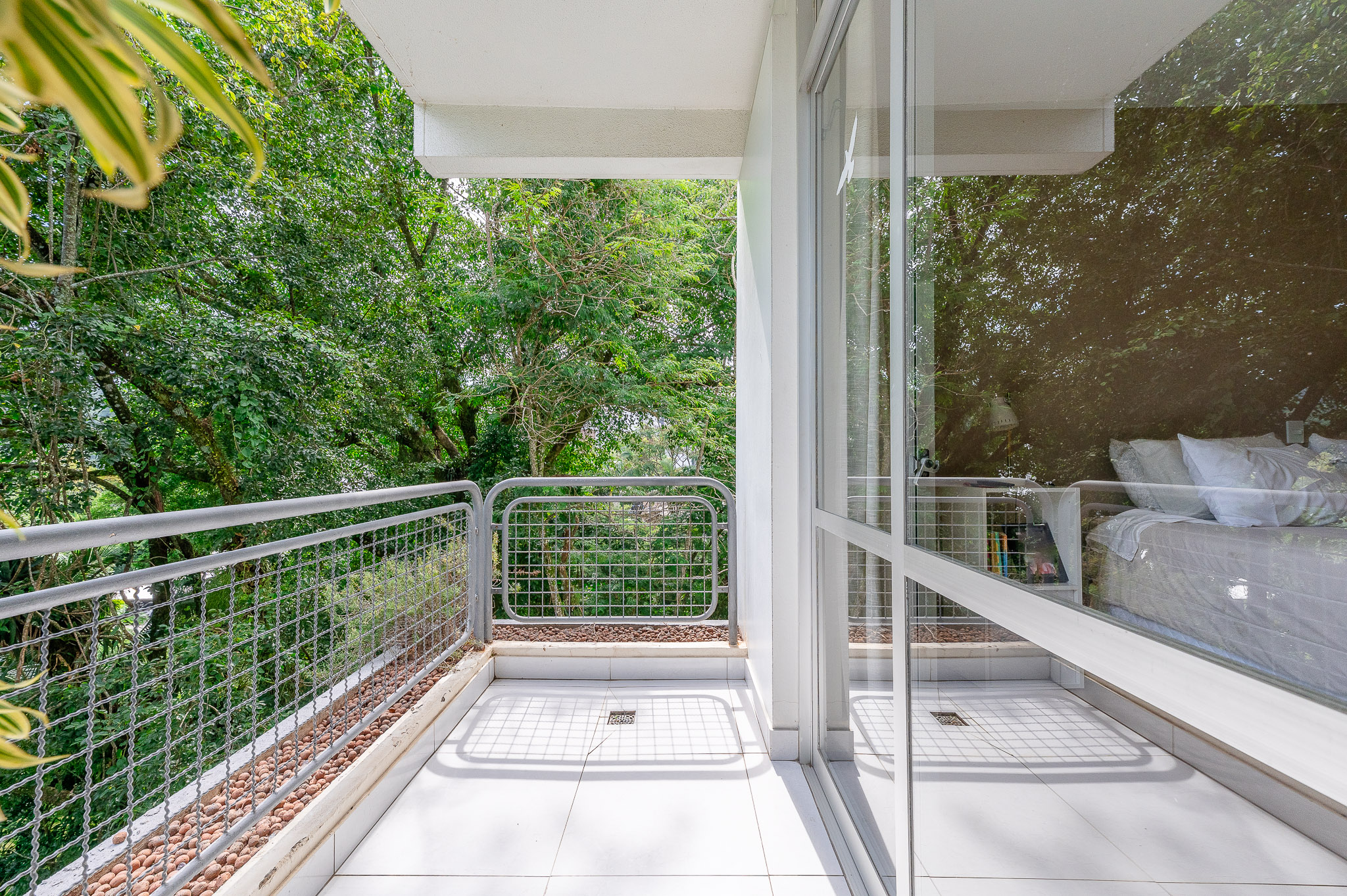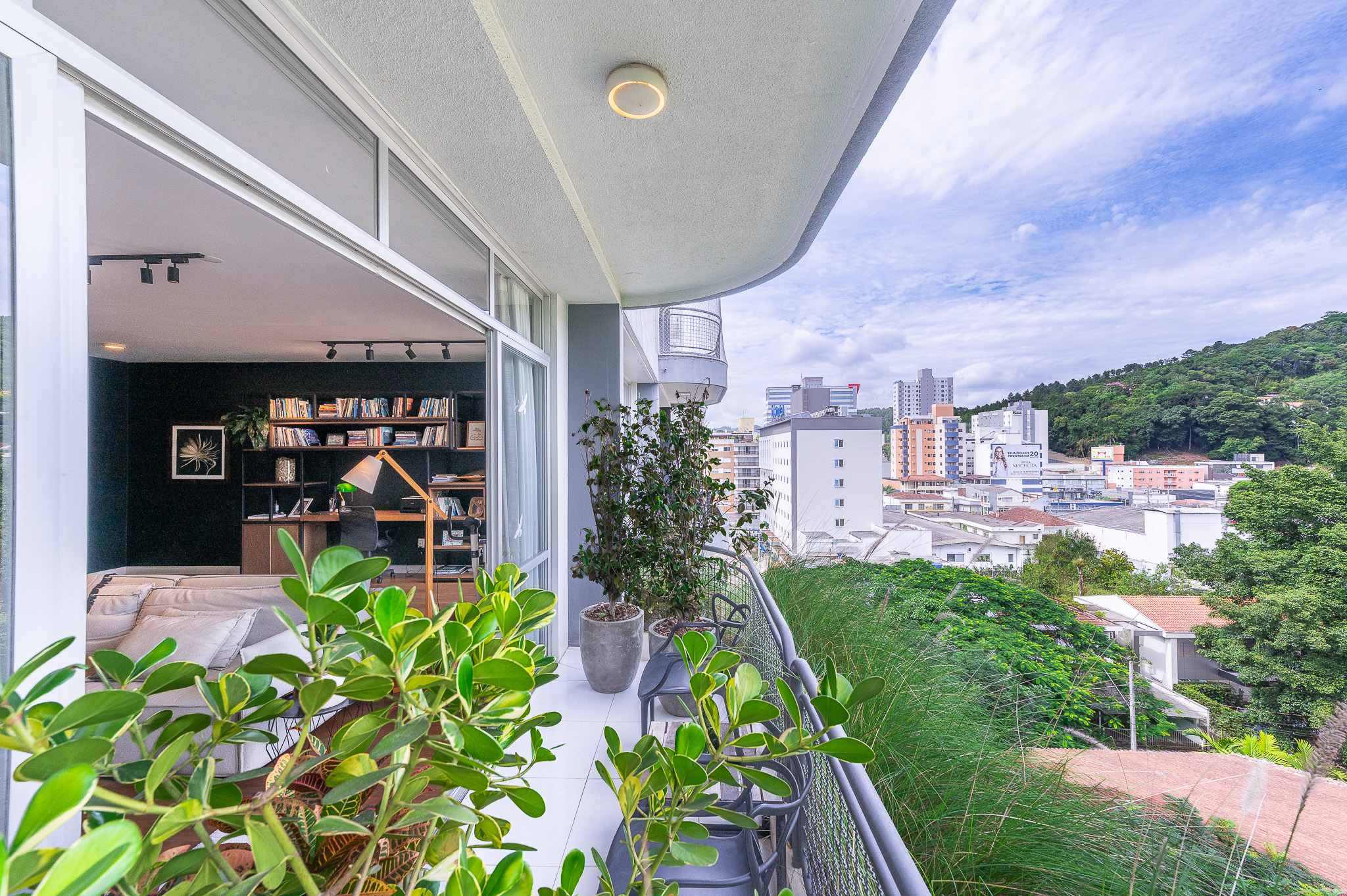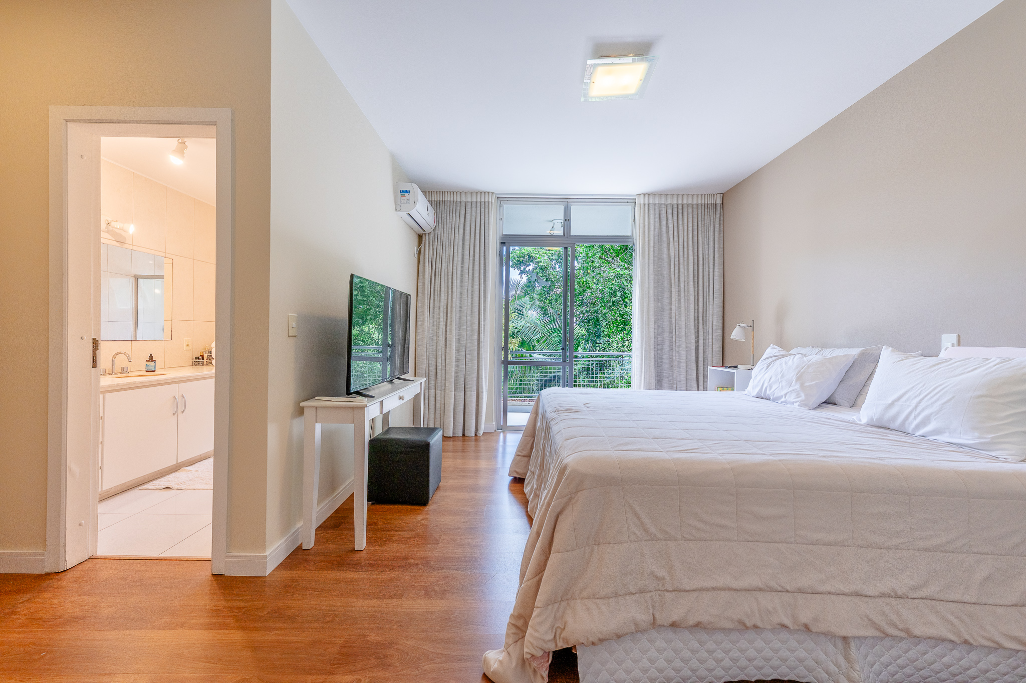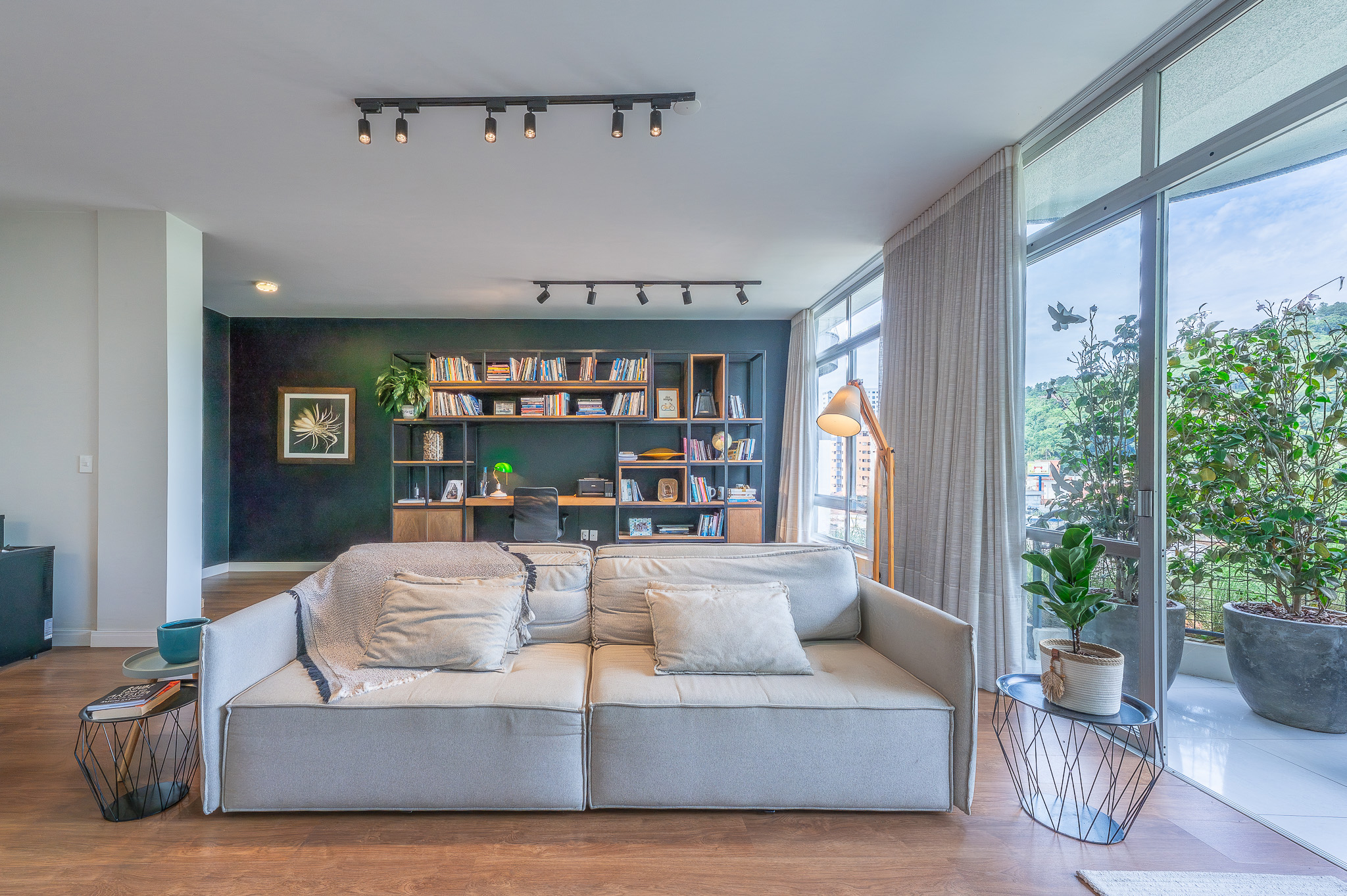 A porta abre e o impacto é imediato: janelões piso-teto trazem o verde para dentro e transformam a imensa sala de estar e jantar em uma verdadeira casa suspensa. A varanda generosa prolonga esse cenário com árvores centenárias, um toque urbano ao fundo e mais verde no horizonte. Luz natural e ventilação atravessam o apê o dia inteiro, criando uma atmosfera leve, viva e silenciosa.