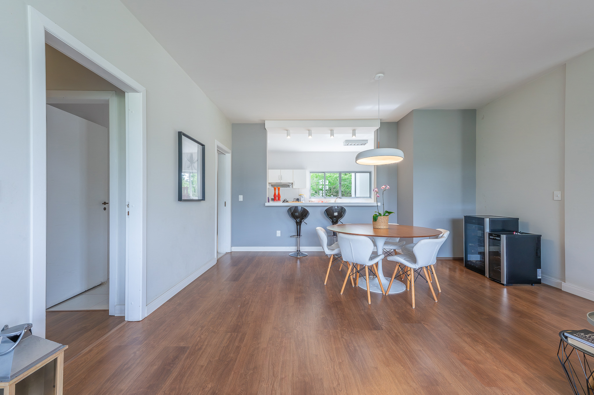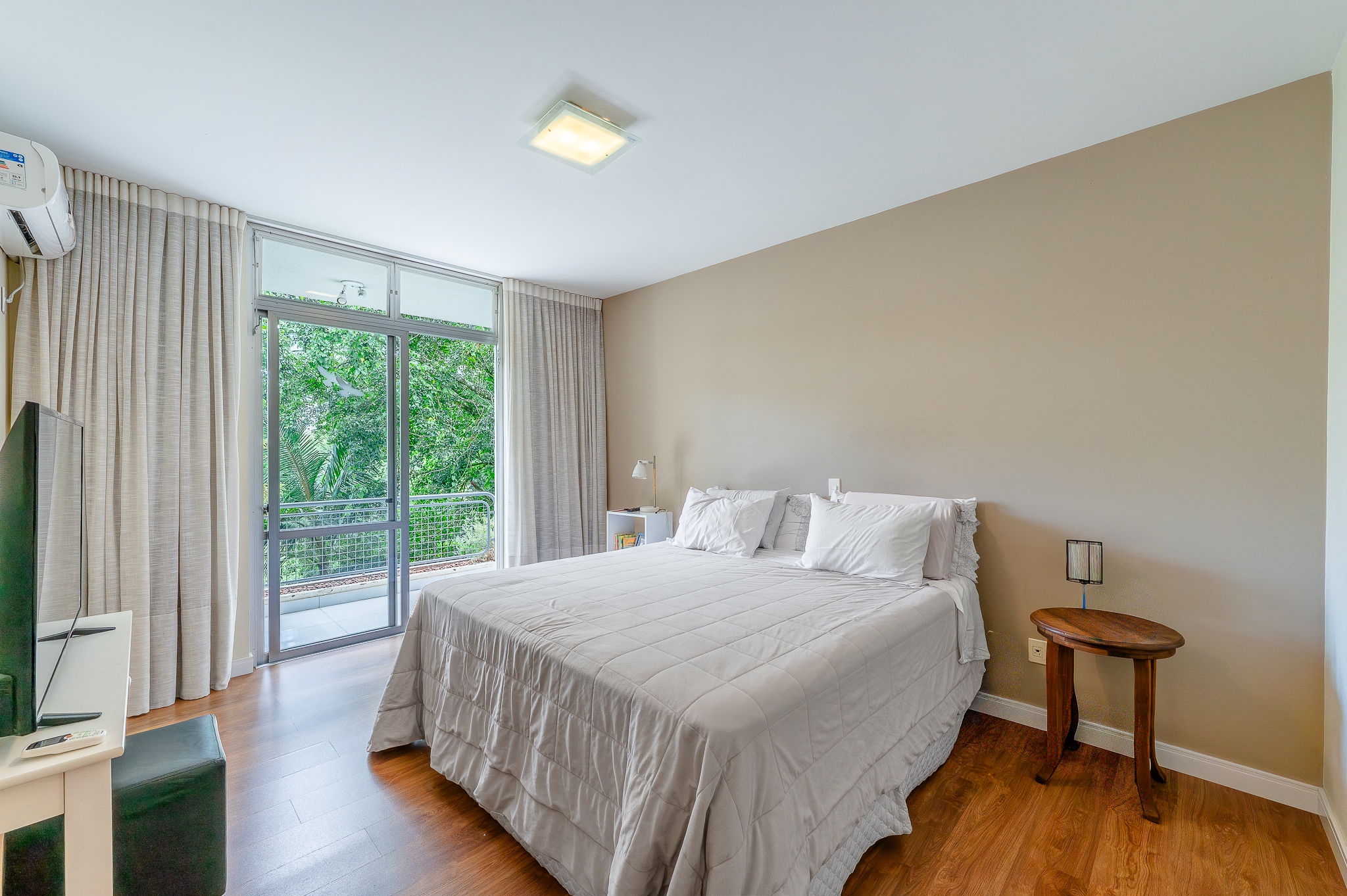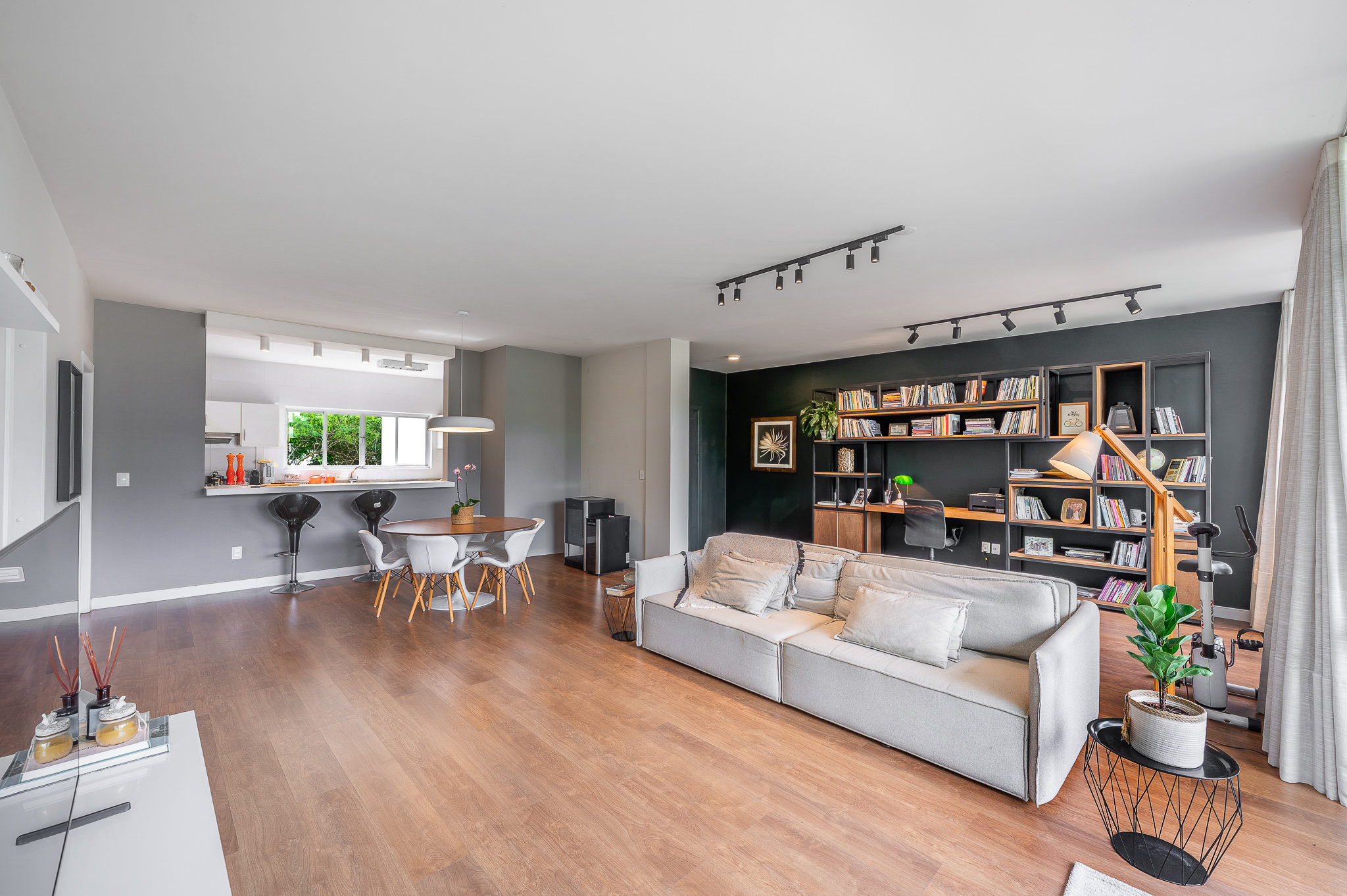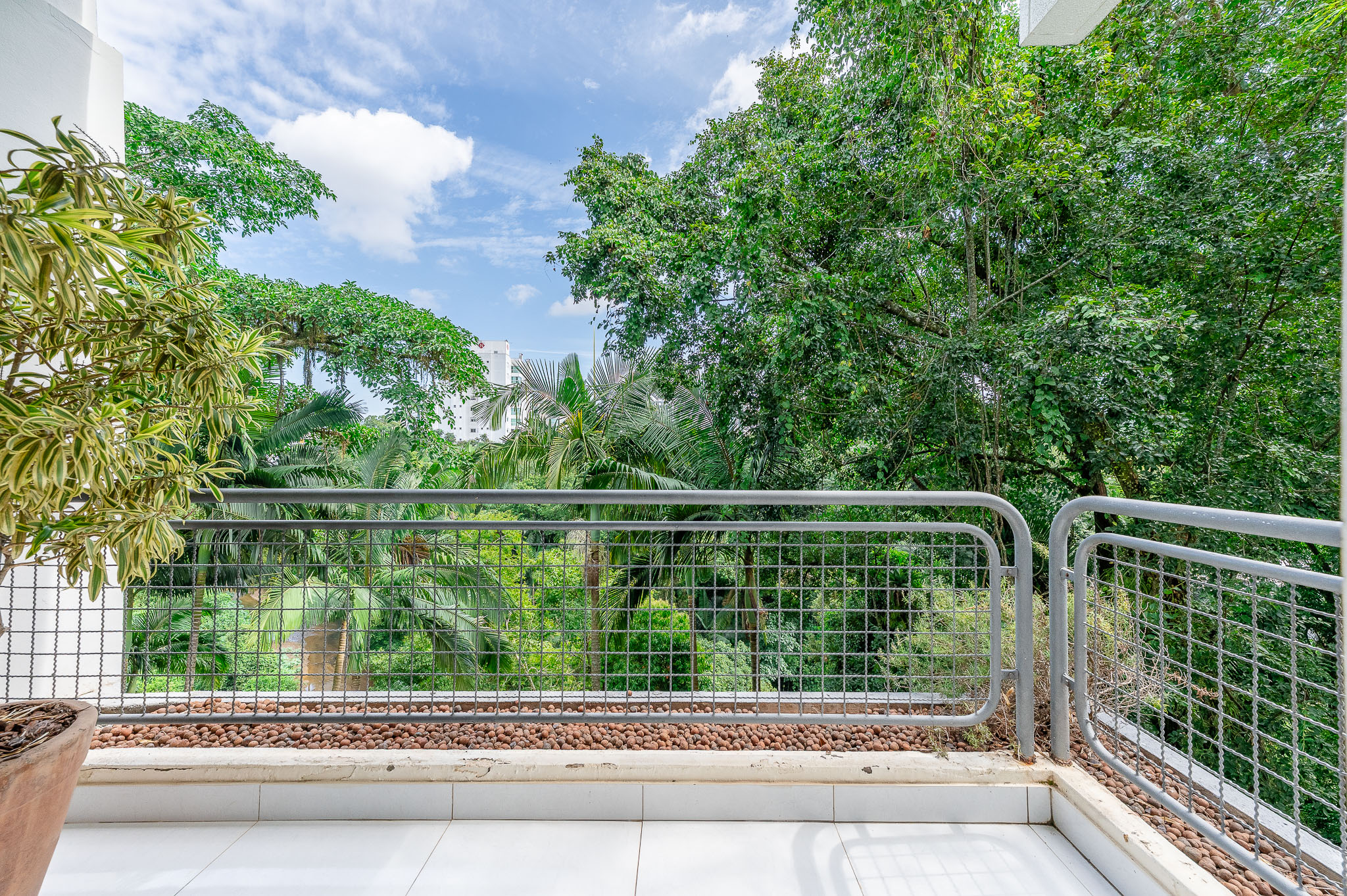 A porta abre e o impacto é imediato: janelões piso-teto trazem o verde para dentro e transformam a imensa sala de estar e jantar em uma verdadeira casa suspensa. A varanda generosa prolonga esse cenário com árvores centenárias, um toque urbano ao fundo e mais verde no horizonte. Luz natural e ventilação atravessam o apê o dia inteiro, criando uma atmosfera leve, viva e silenciosa.