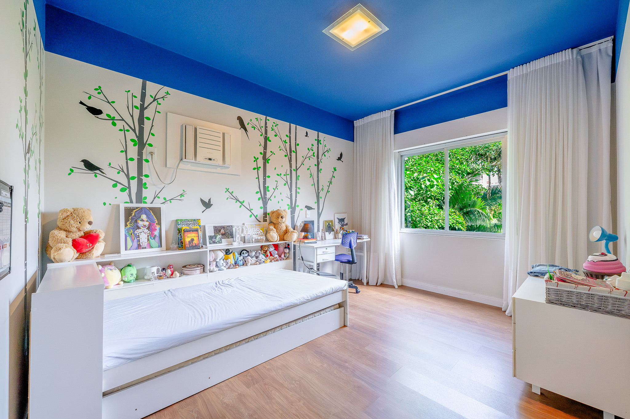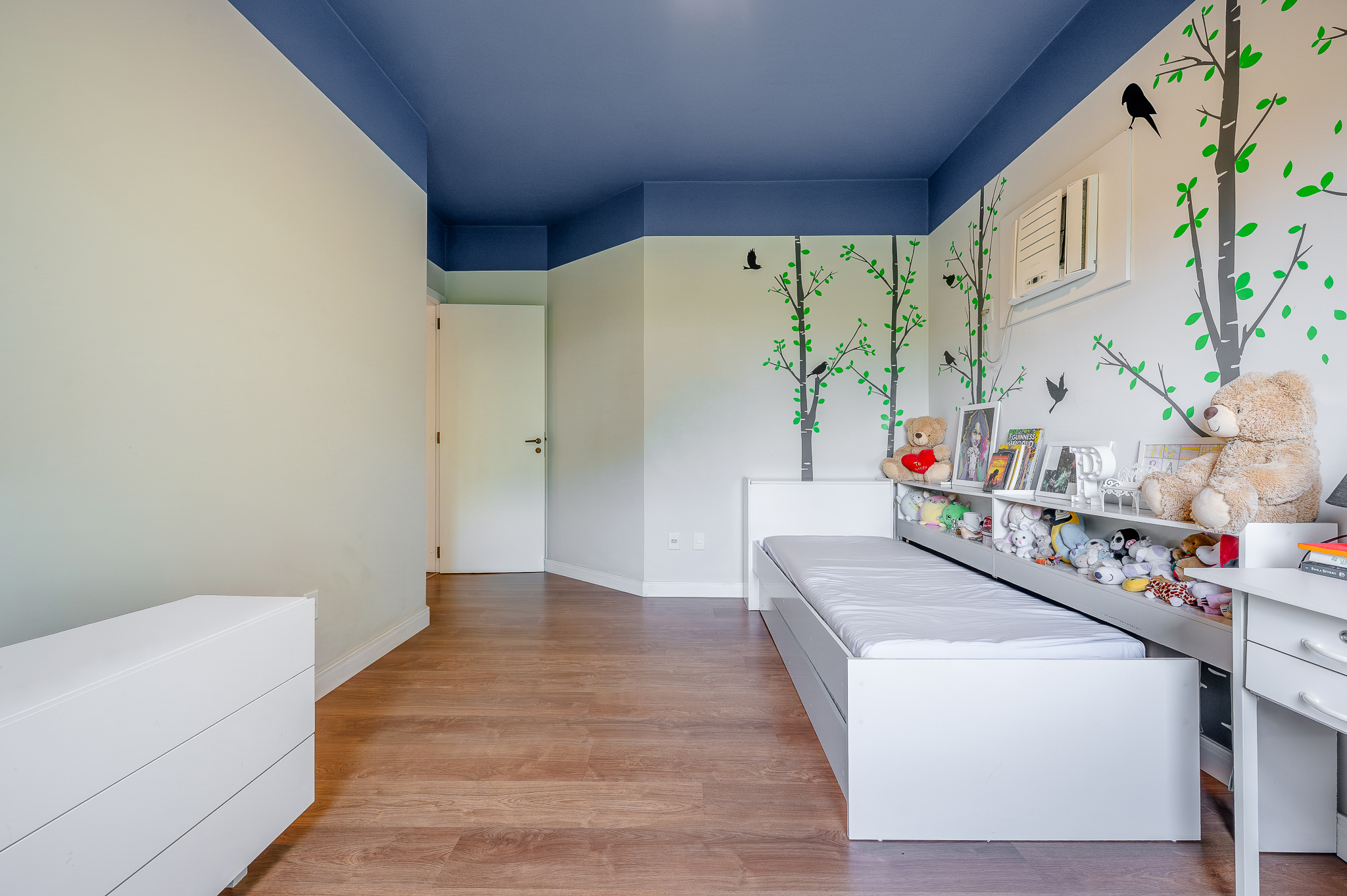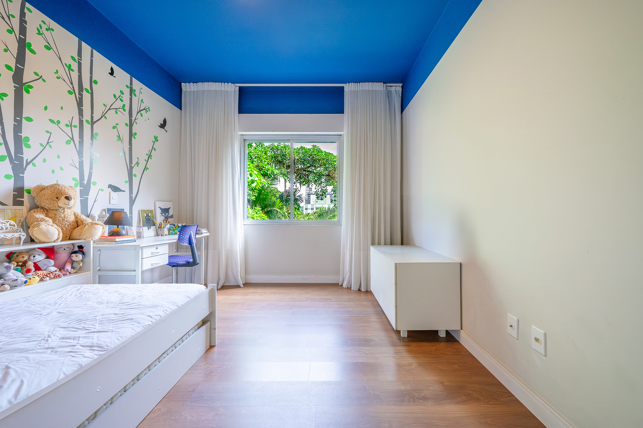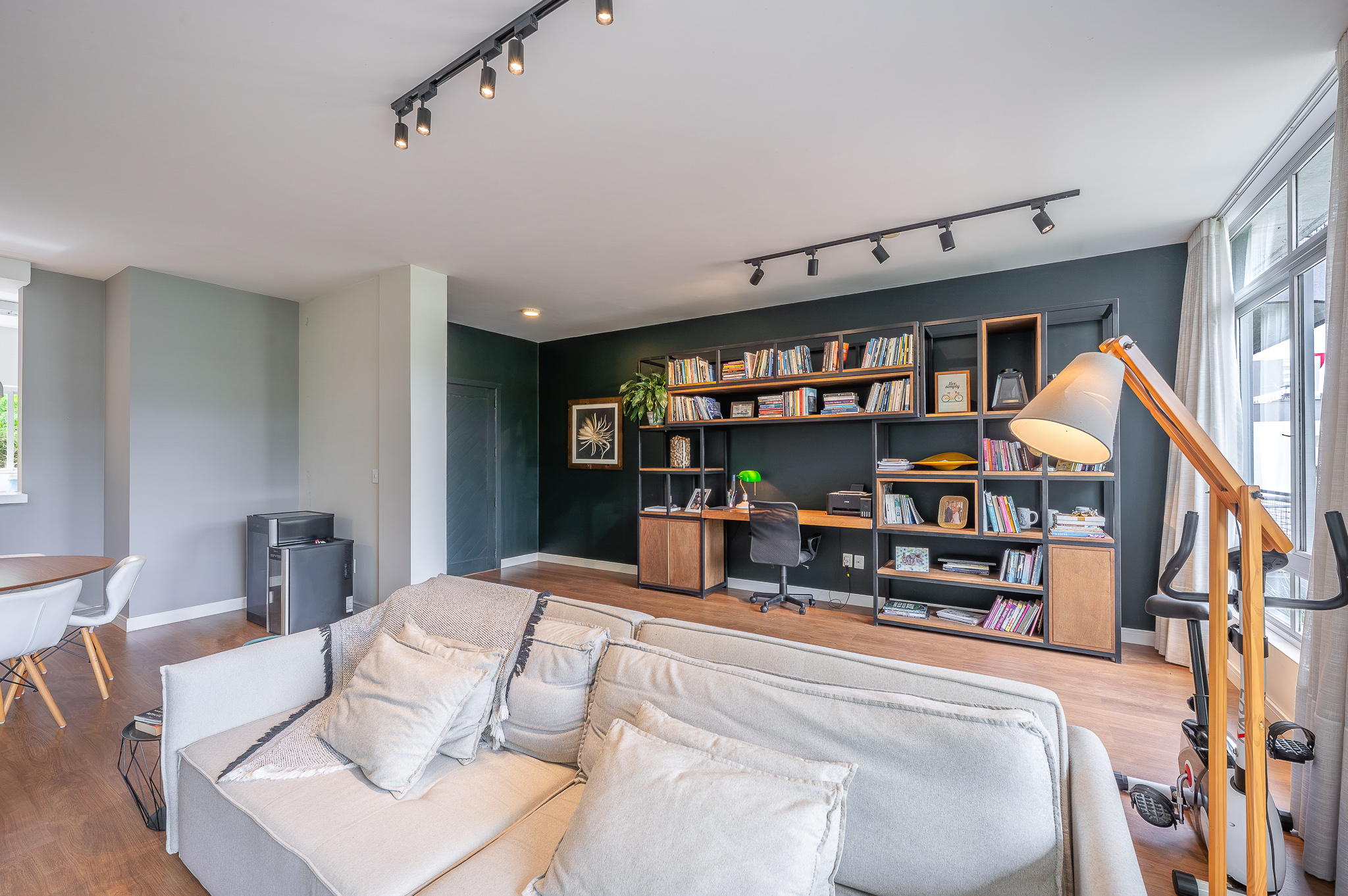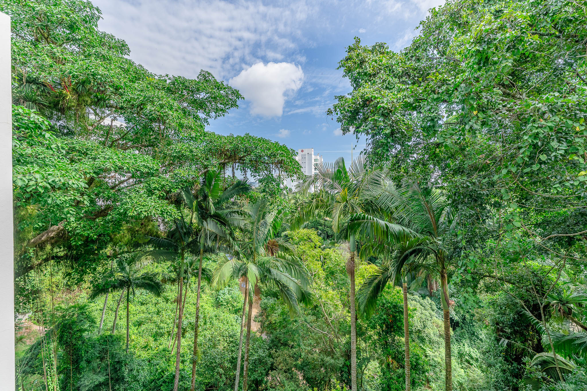 A porta abre e o impacto é imediato: janelões piso-teto trazem o verde para dentro e transformam a imensa sala de estar e jantar em uma verdadeira casa suspensa. A varanda generosa prolonga esse cenário com árvores centenárias, um toque urbano ao fundo e mais verde no horizonte. Luz natural e ventilação atravessam o apê o dia inteiro, criando uma atmosfera leve, viva e silenciosa.