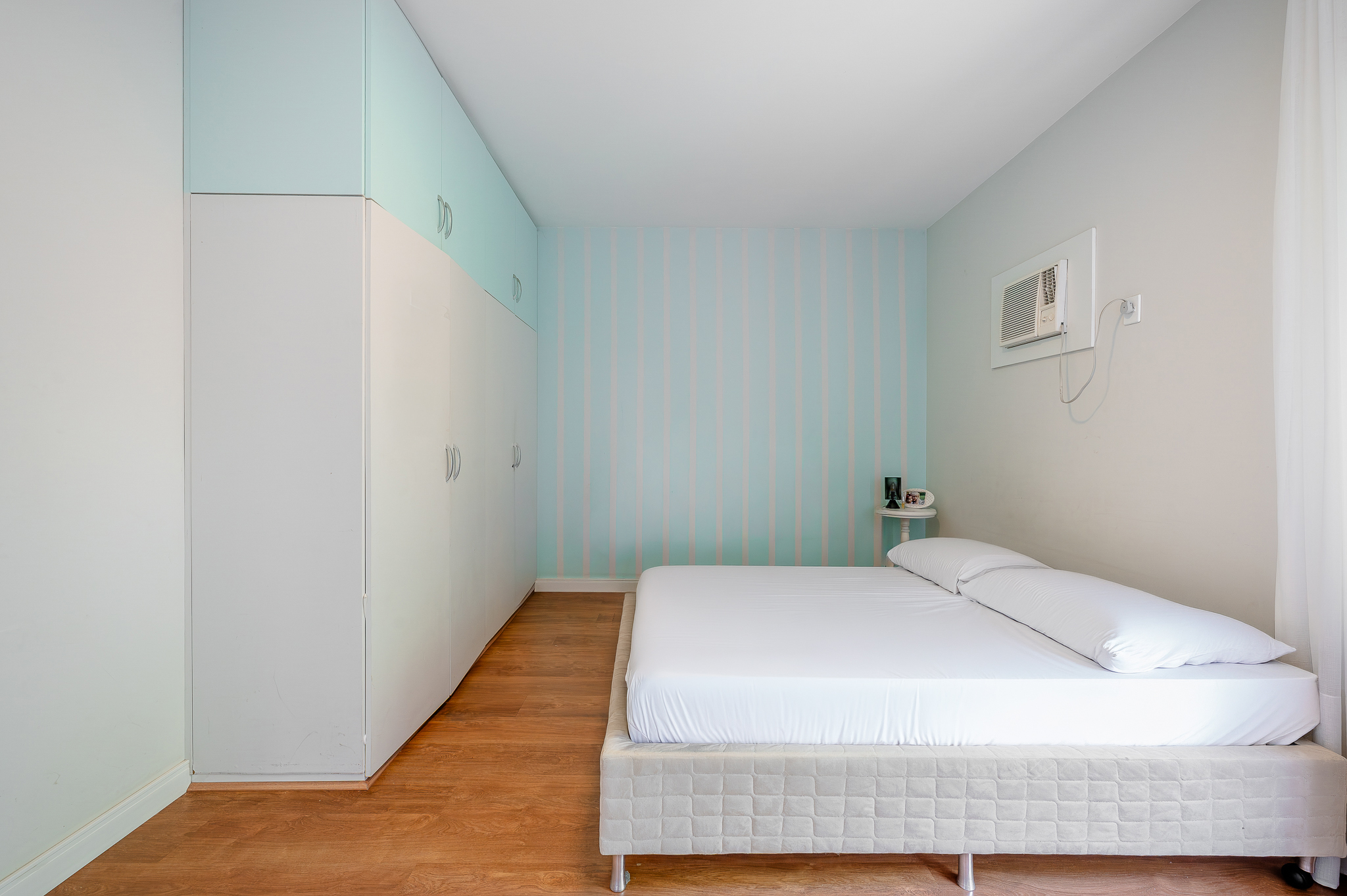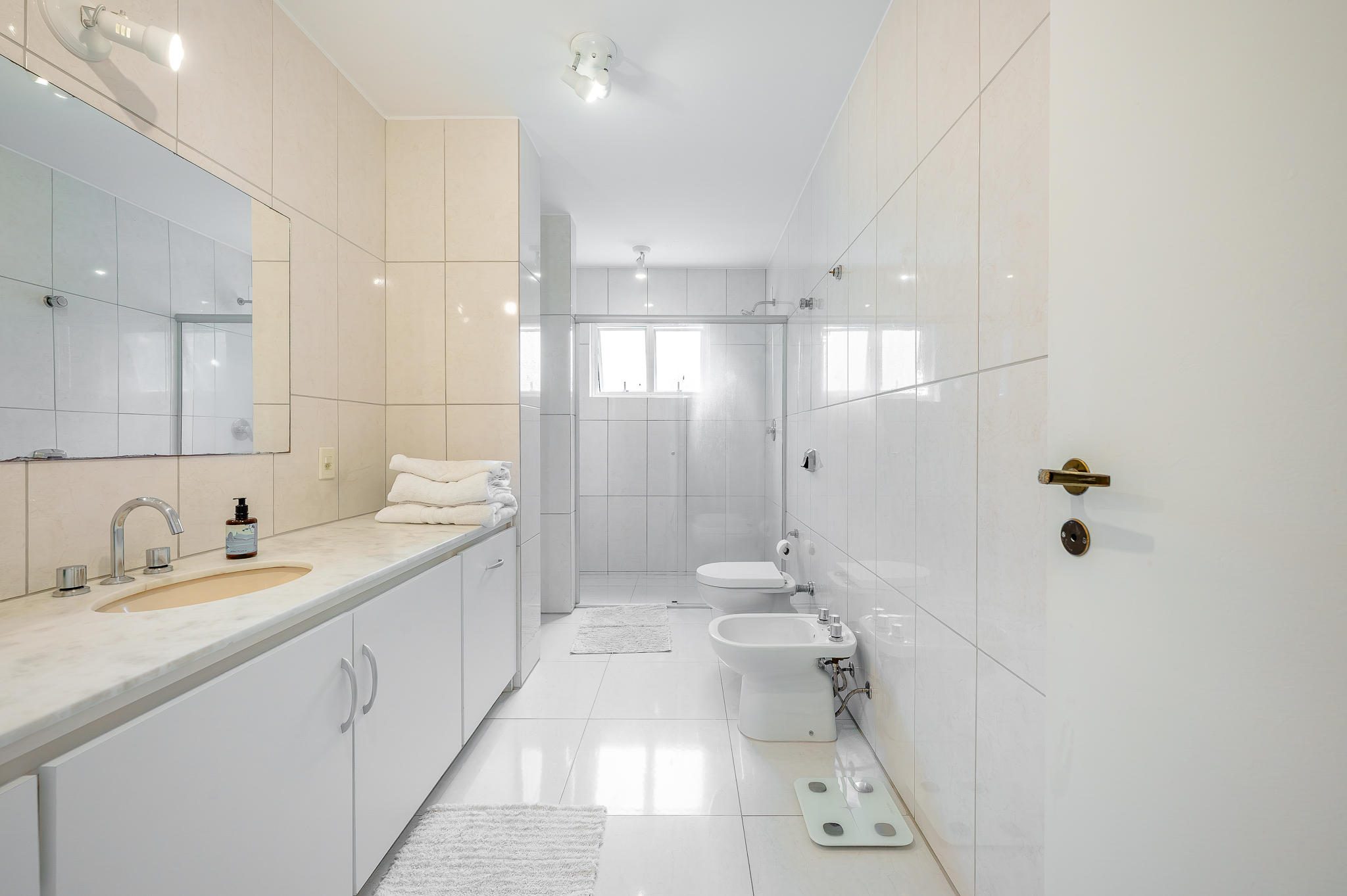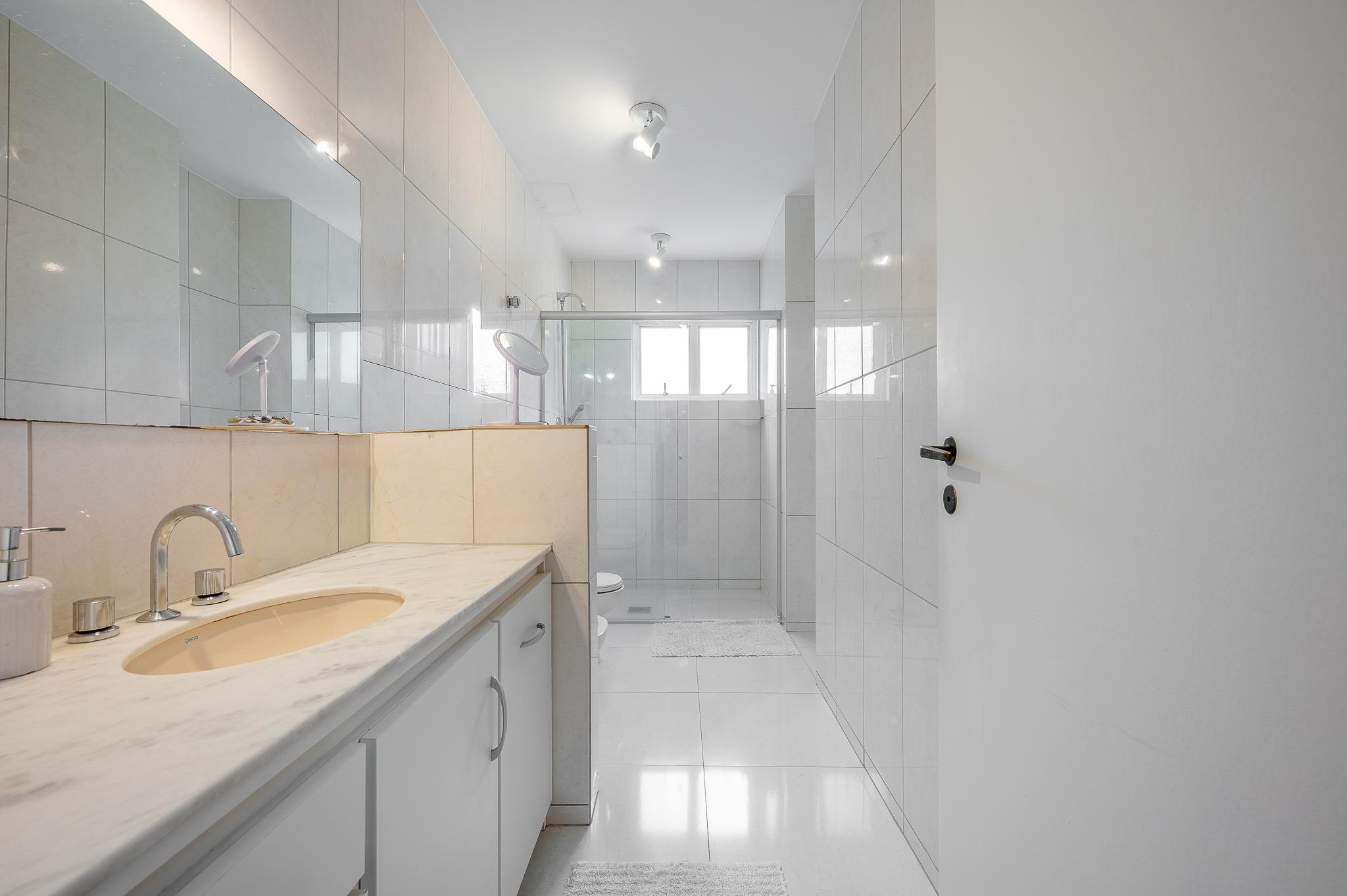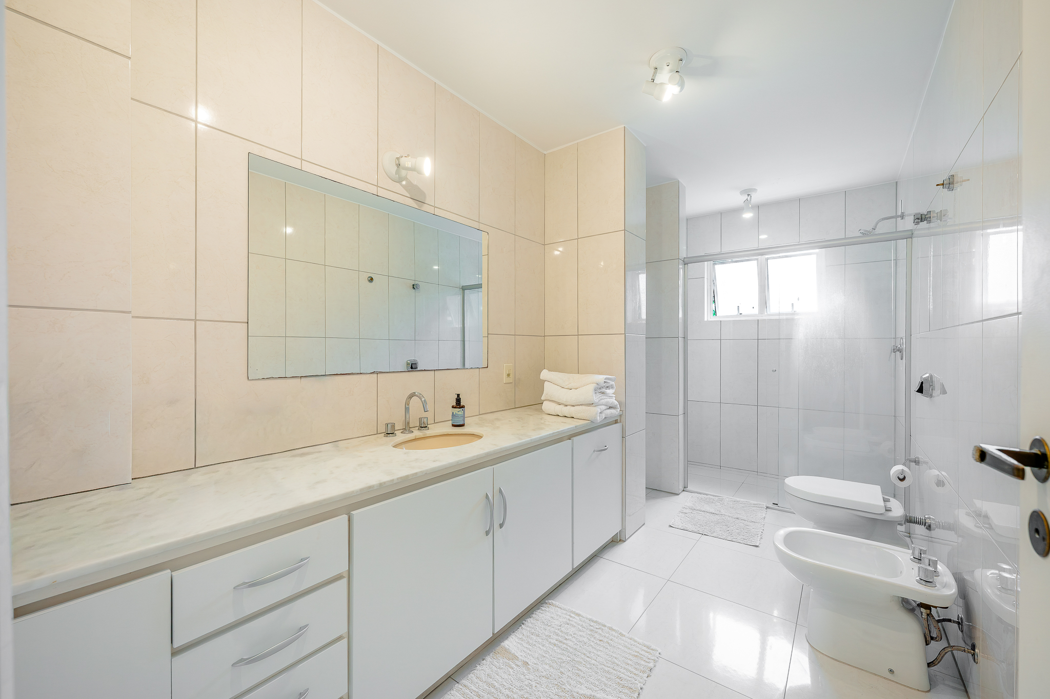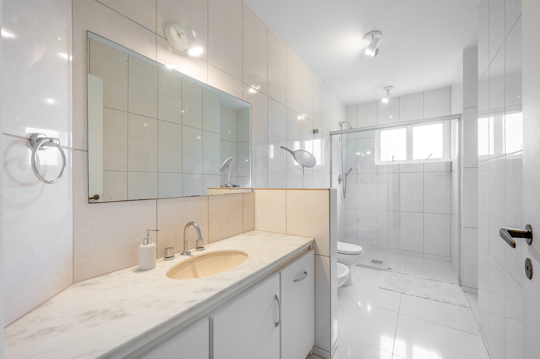 Na área íntima, o corredor revela um lavabo cheio de personalidade, dois quartos amplos com aquela vista que nunca cansa e uma suíte master generosa de verdade. O detalhe que marca está na varandinha com janelão voltado para uma figueira centenária que abraça o prédio como um símbolo de permanência. Tem closet e um banheiro amplo para completar.