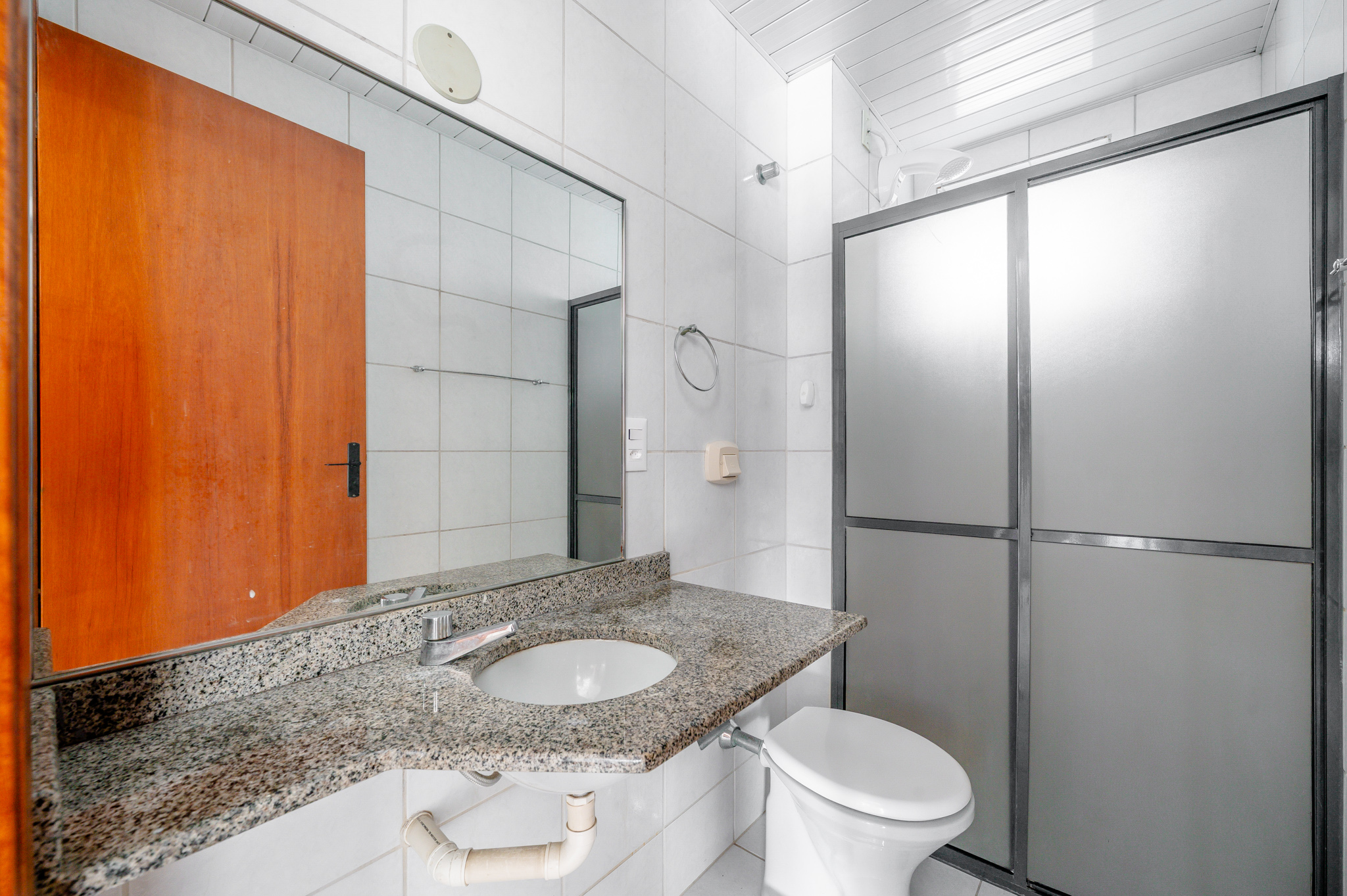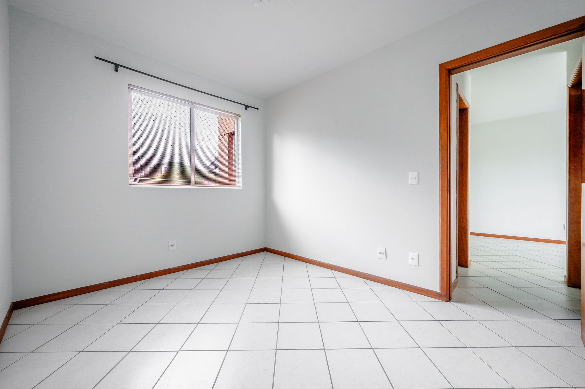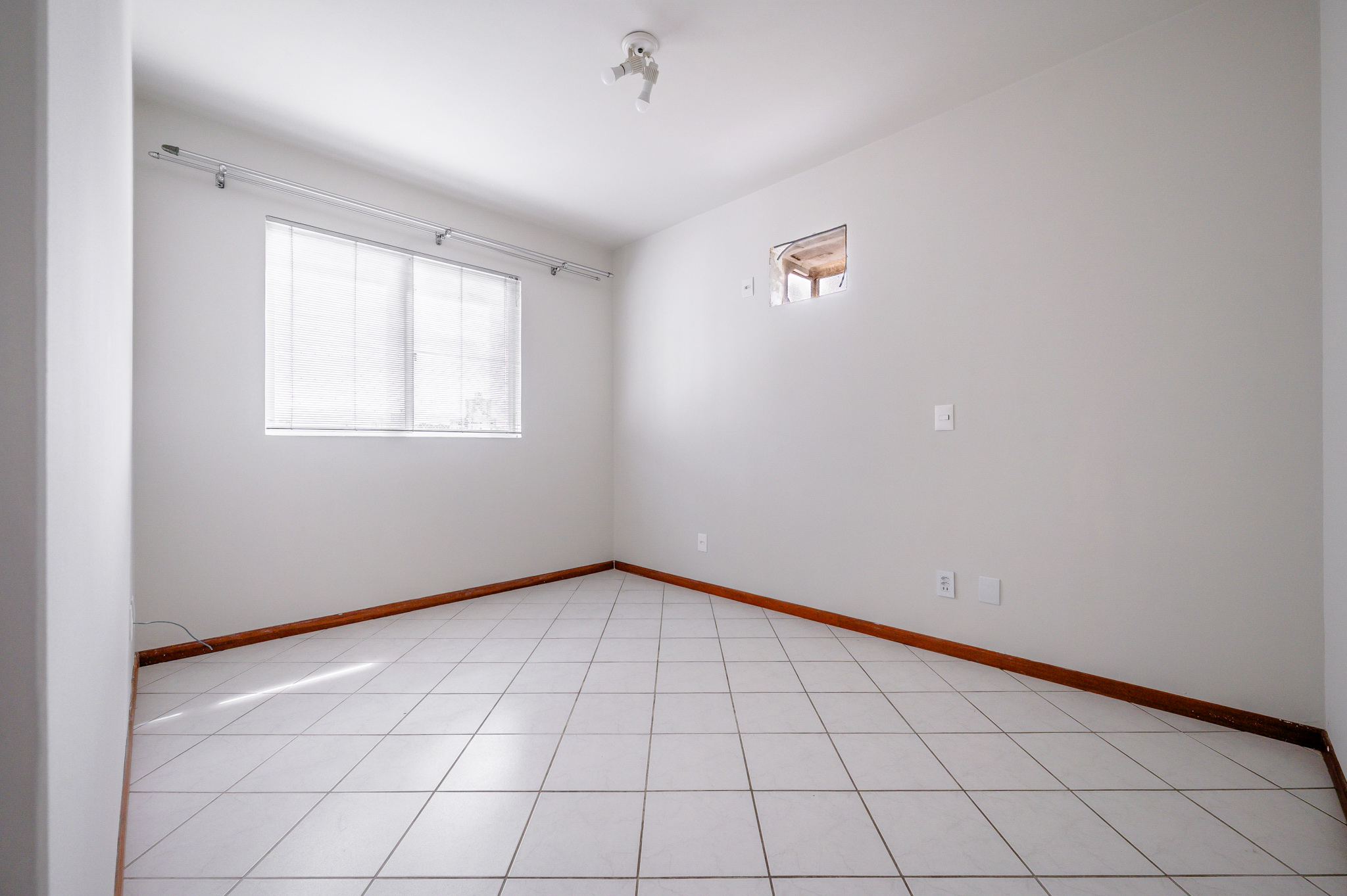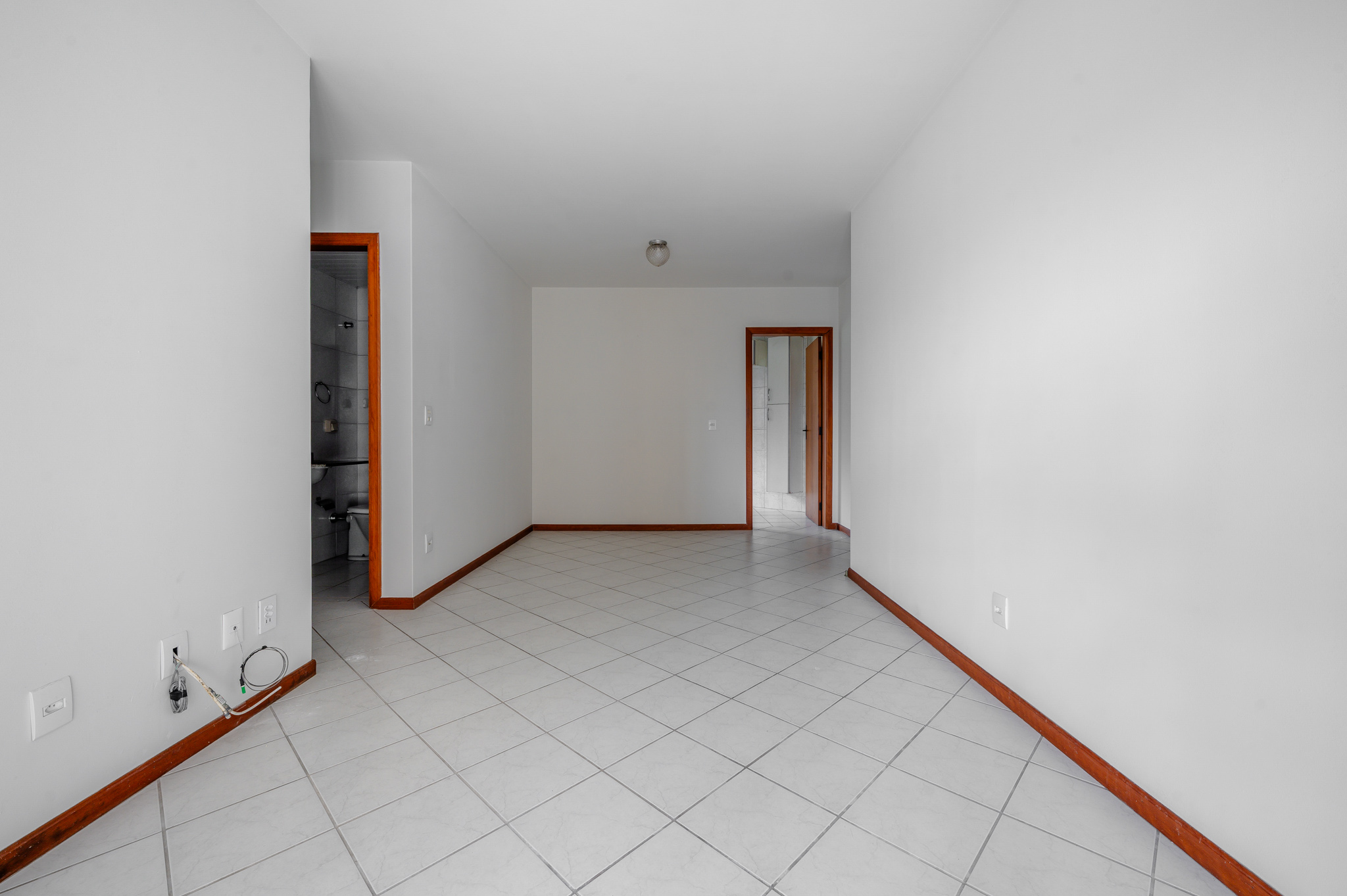 Um corredor leva a dois quartos bem ventilados — um deles, a suíte, com um banheiro super iluminado. Um banheiro social atende os demais ambientes.