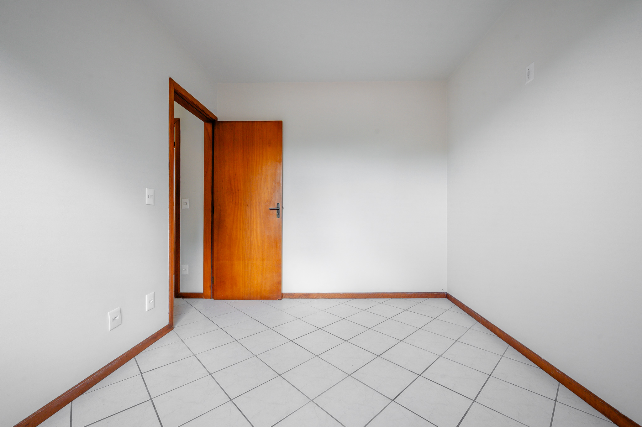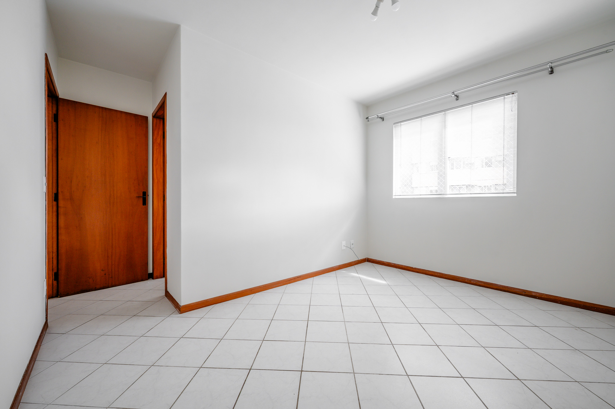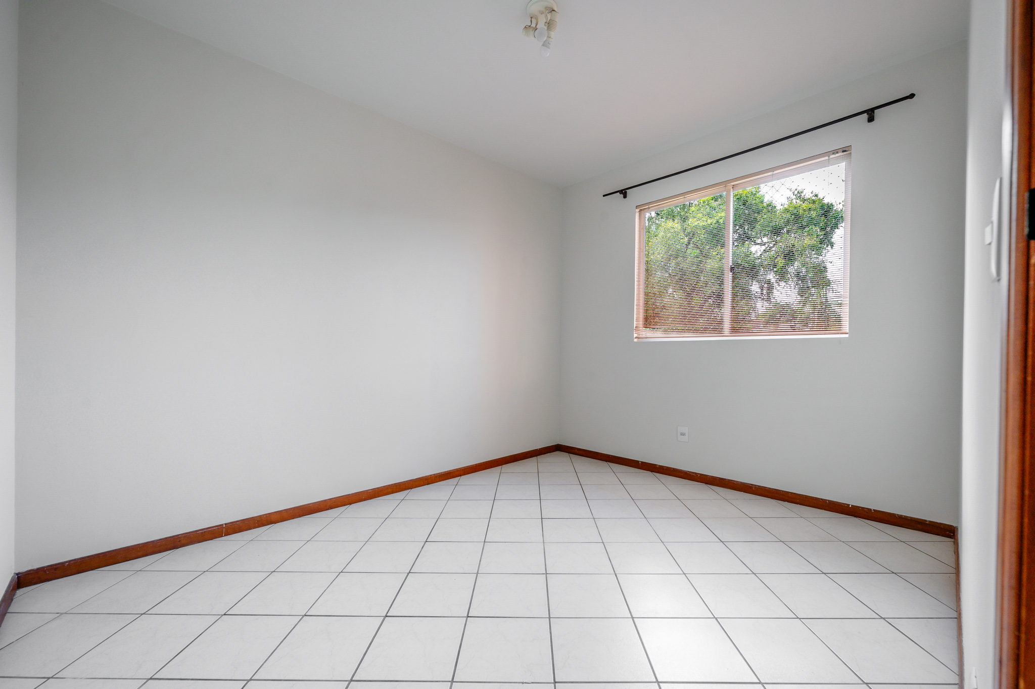 Um corredor leva a dois quartos bem ventilados — um deles, a suíte, com um banheiro super iluminado. Um banheiro social atende os demais ambientes.