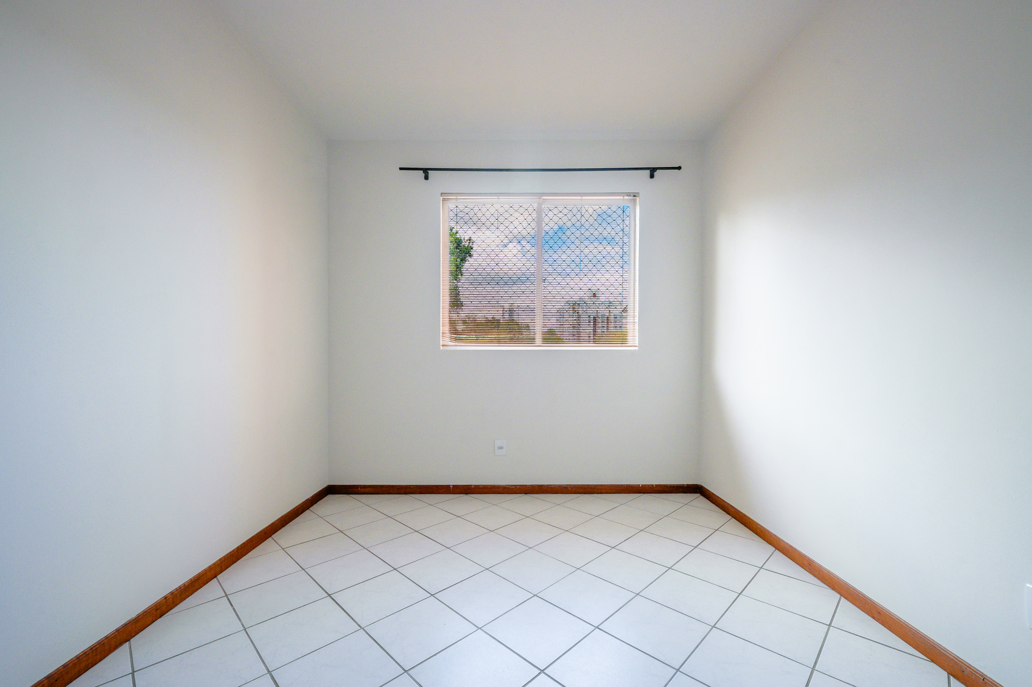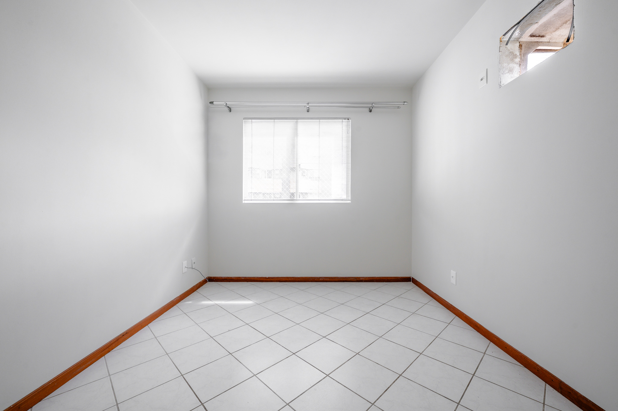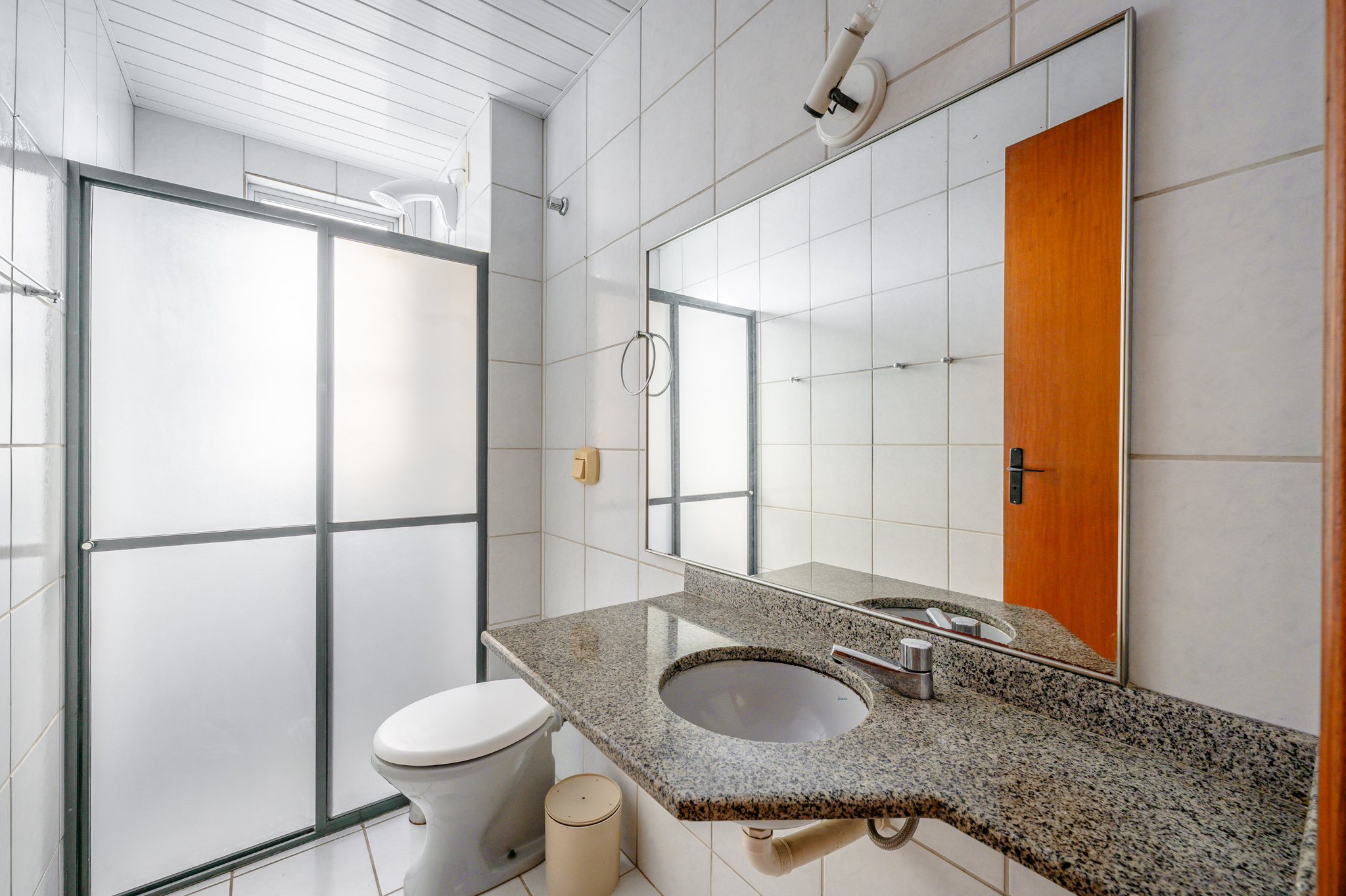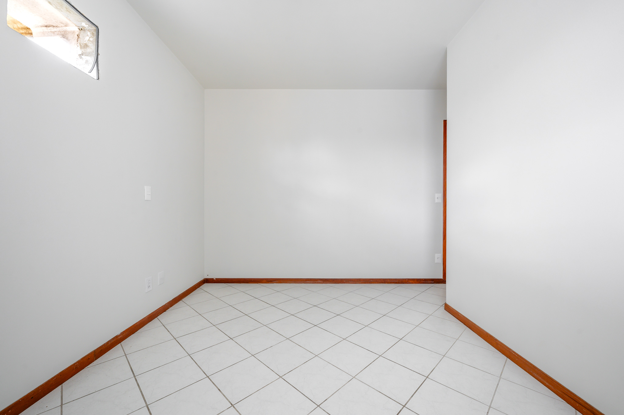 Um corredor leva a dois quartos bem ventilados — um deles, a suíte, com um banheiro super iluminado. Um banheiro social atende os demais ambientes.