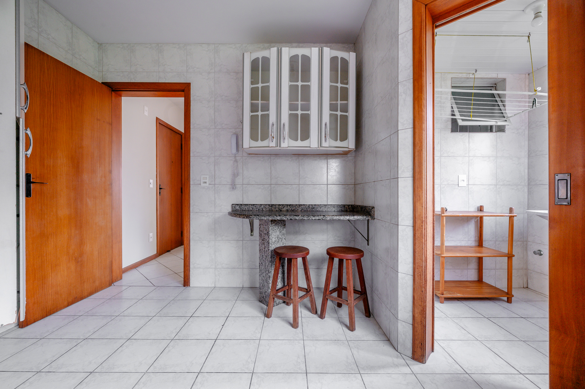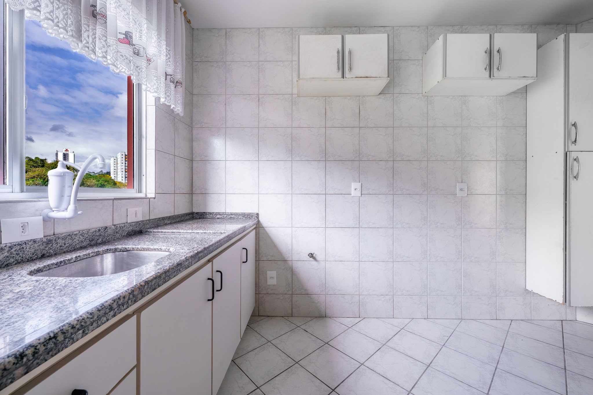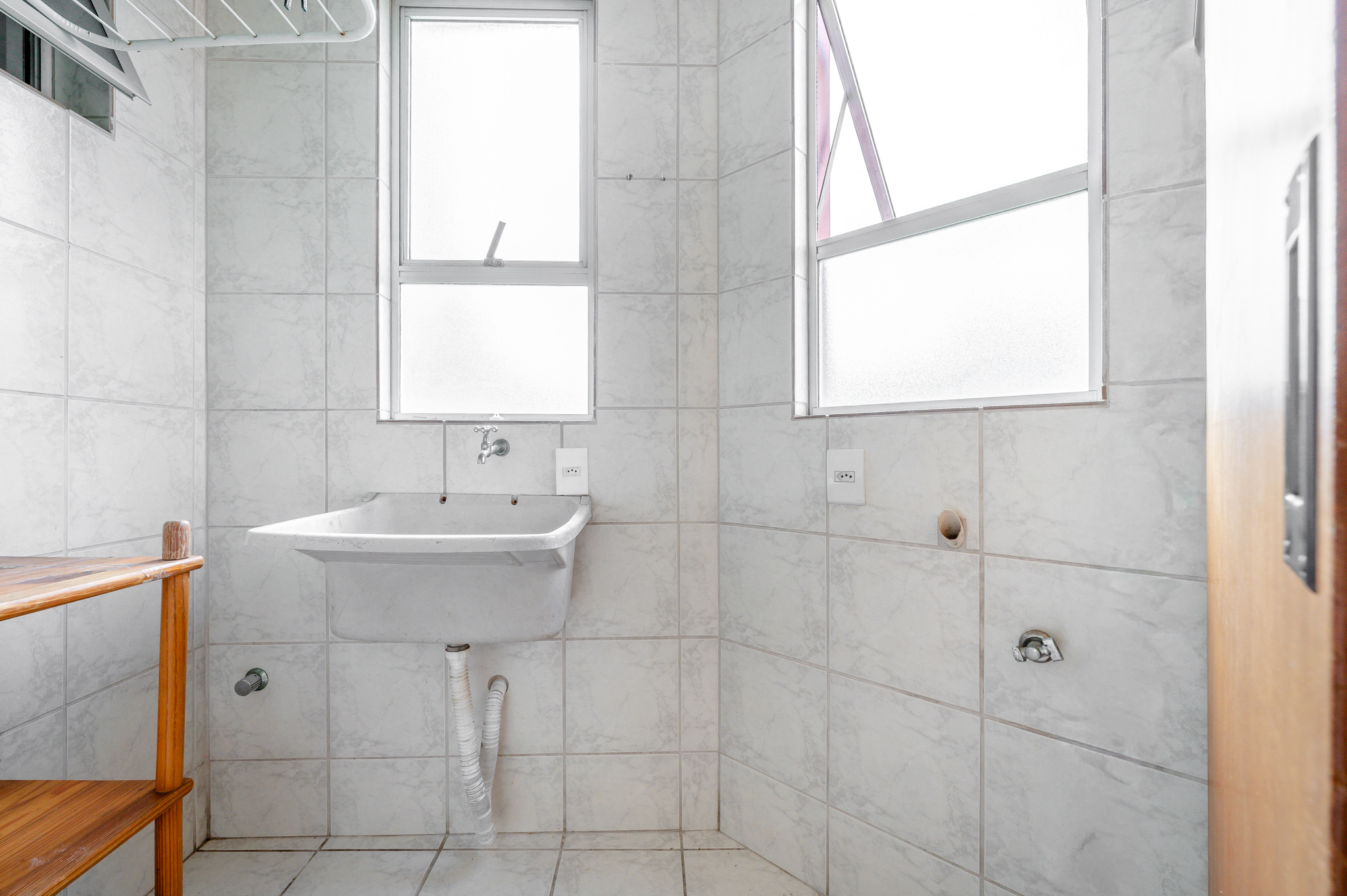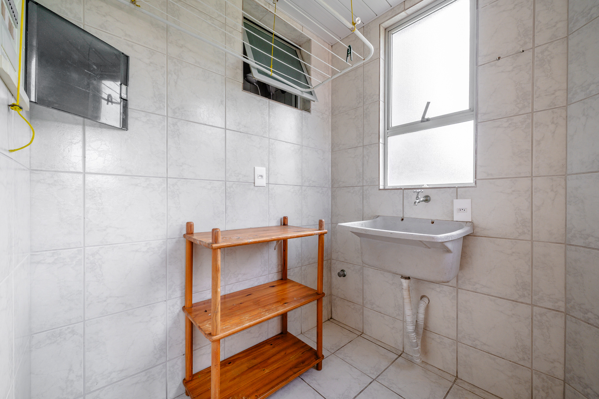 Uma porta de correr separa a área de serviço, bem ventilada e funcional.