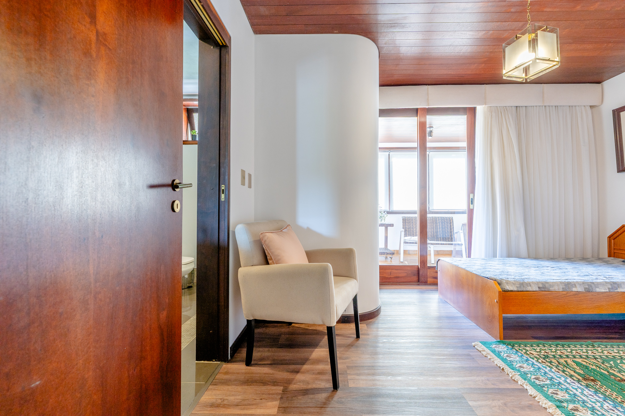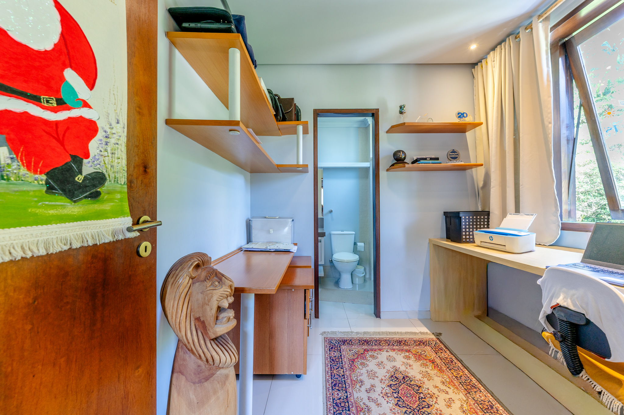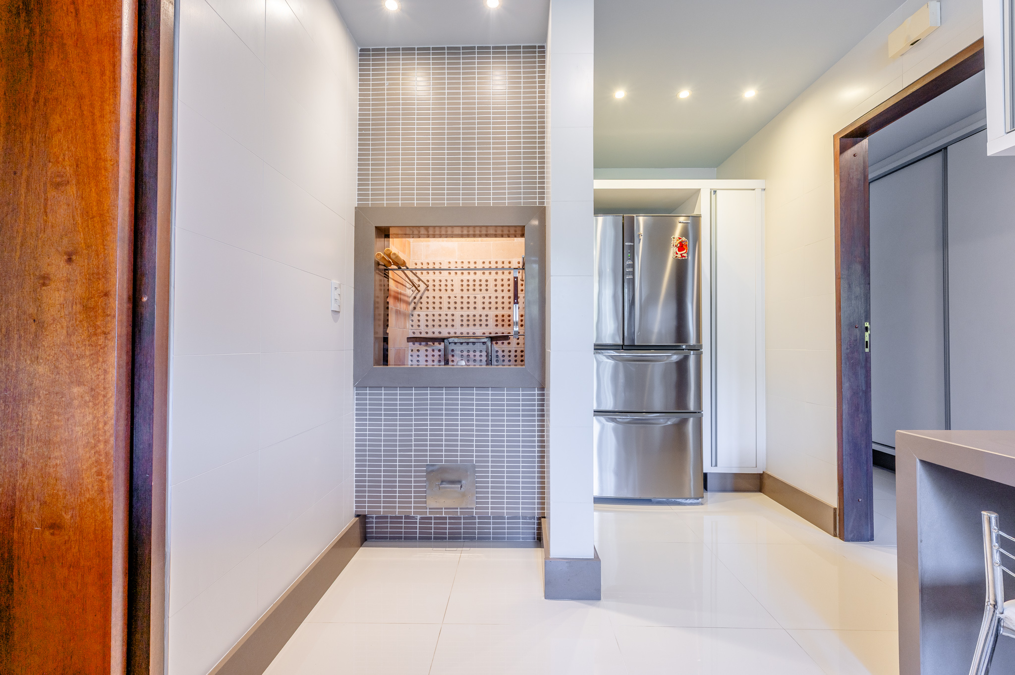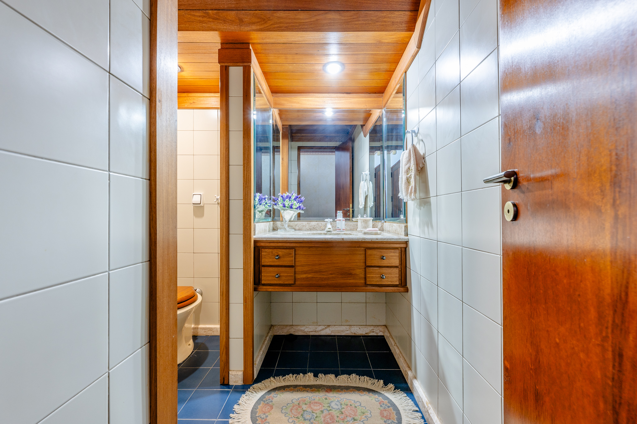 Pela porta lateral, você chega à copa espaçosa e à cozinha reformada e equipada, com churrasqueira e ventilação cruzada graças ao janelão da bancada, que ainda emoldura um cenário cinematográfico lá fora. A área de serviço é ampla, ventilada, com despensa e gás de passagem. A antiga dependência de empregada virou um quarto/home office com banheiro.