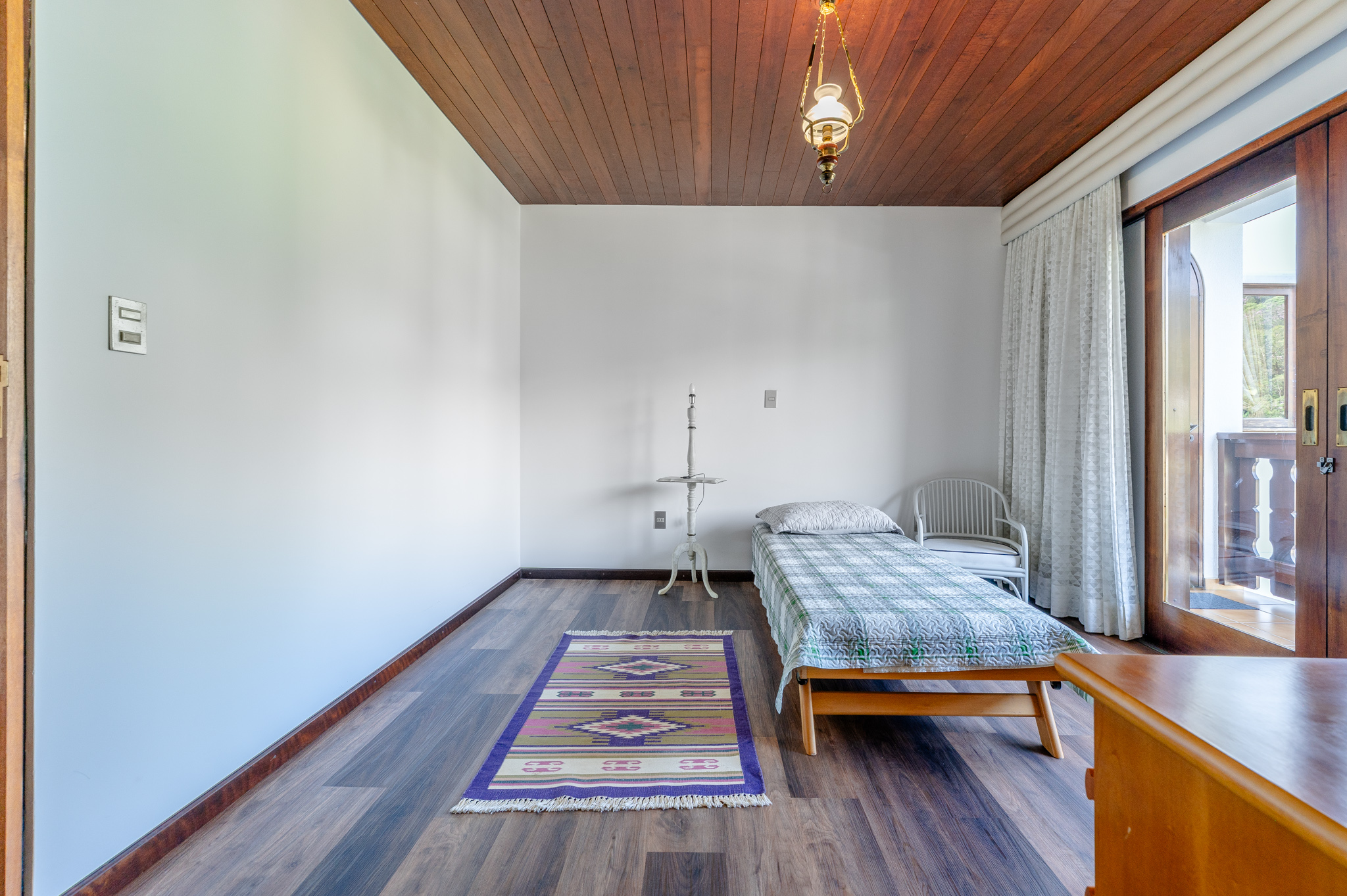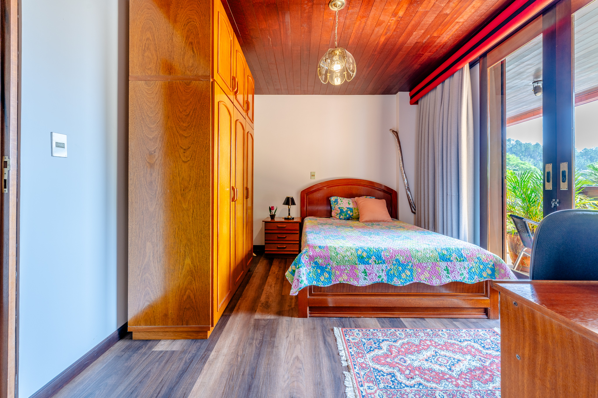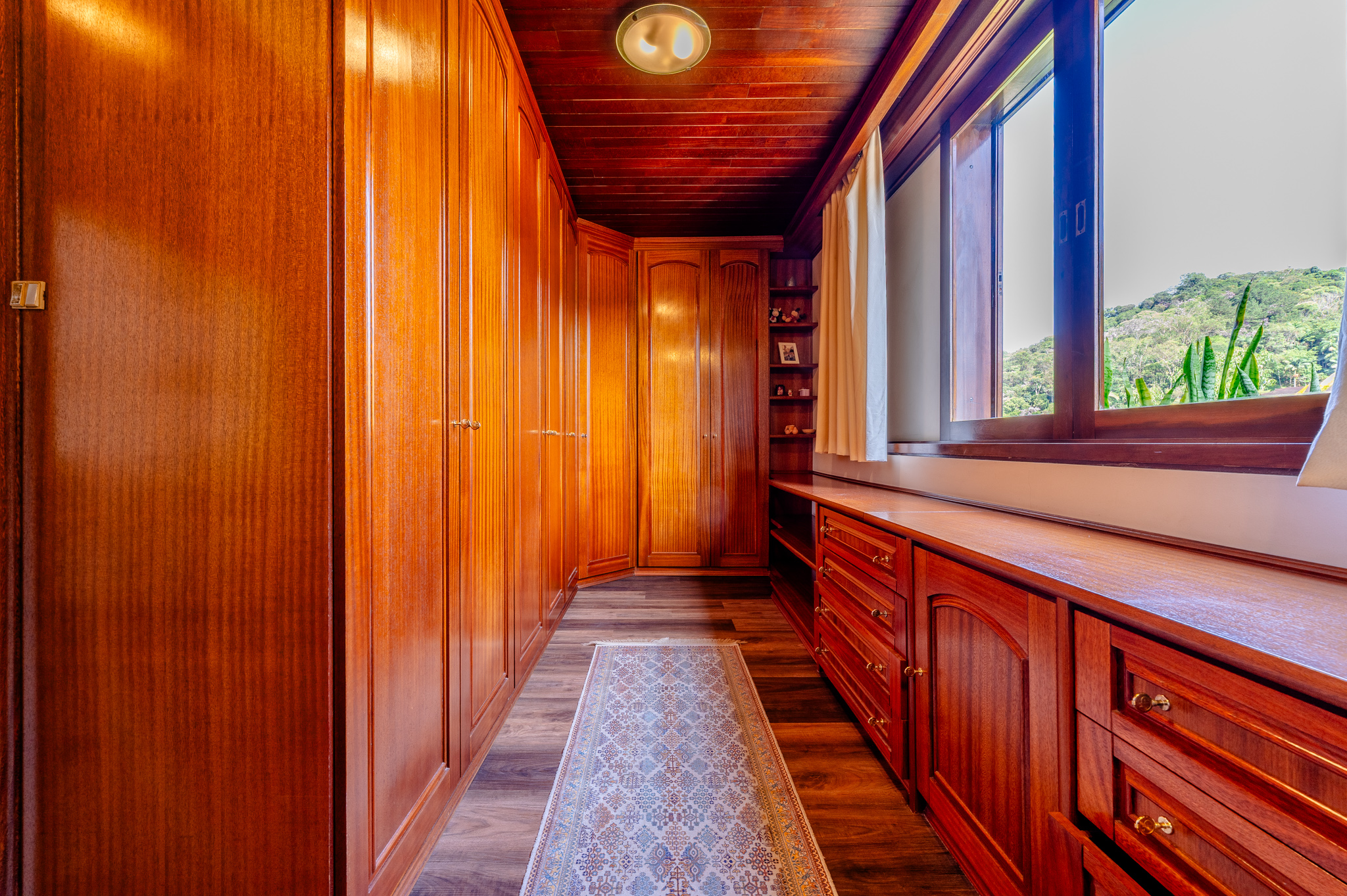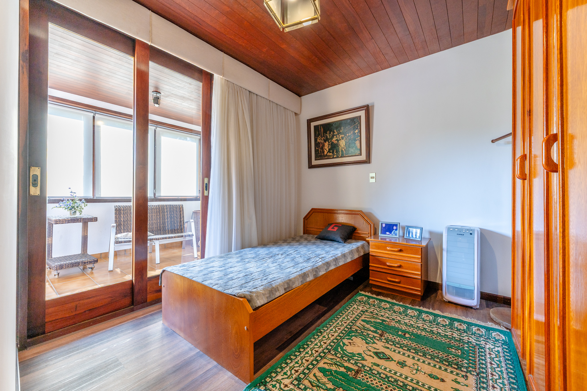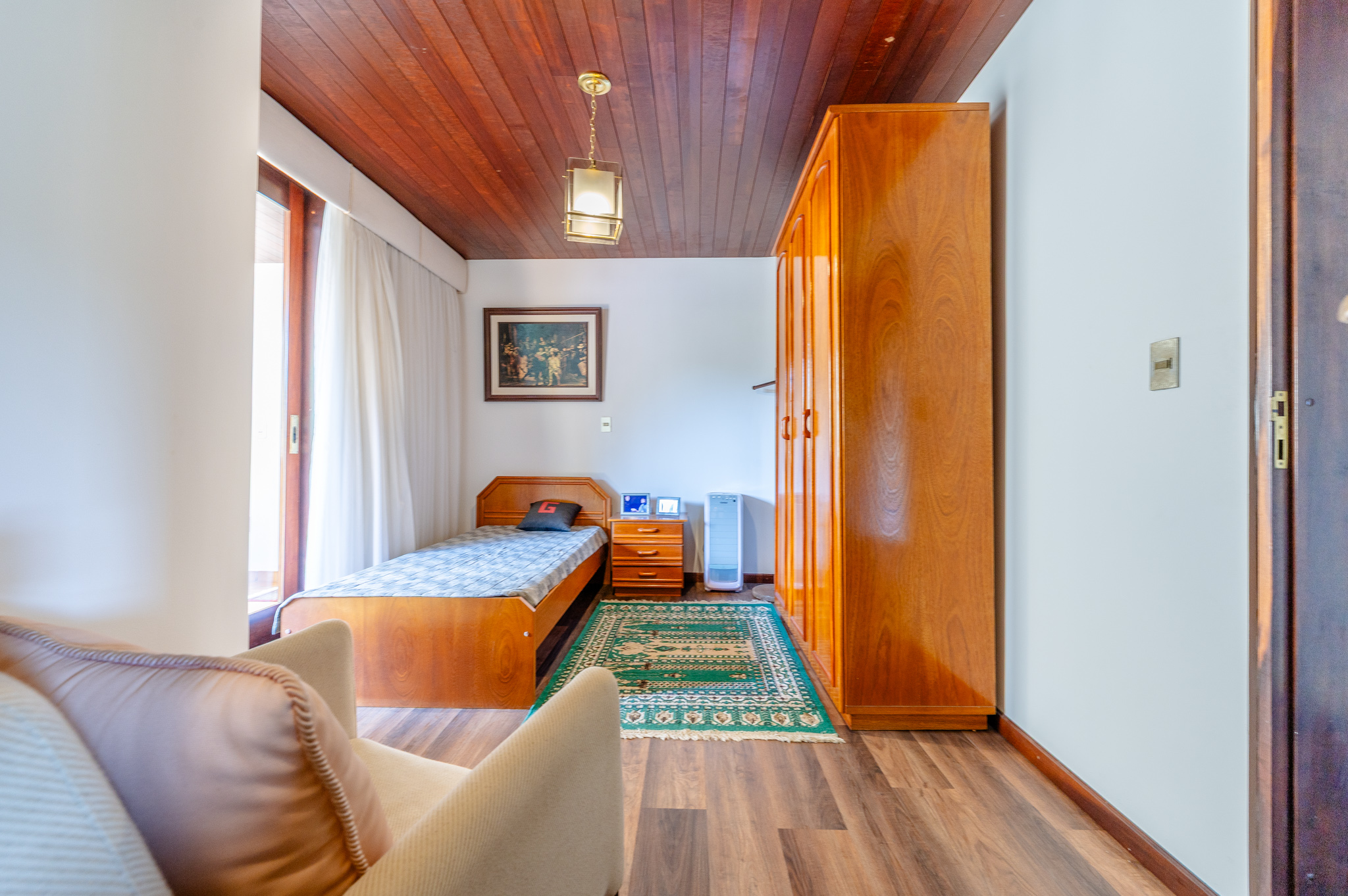 Pela porta lateral, você chega à copa espaçosa e à cozinha reformada e equipada, com churrasqueira e ventilação cruzada graças ao janelão da bancada, que ainda emoldura um cenário cinematográfico lá fora. A área de serviço é ampla, ventilada, com despensa e gás de passagem. A antiga dependência de empregada virou um quarto/home office com banheiro.